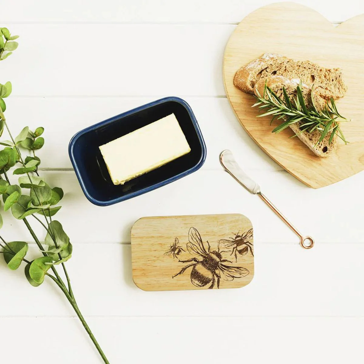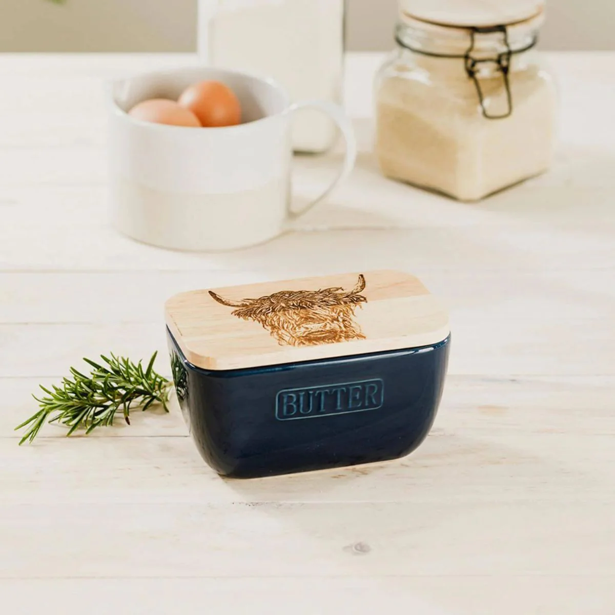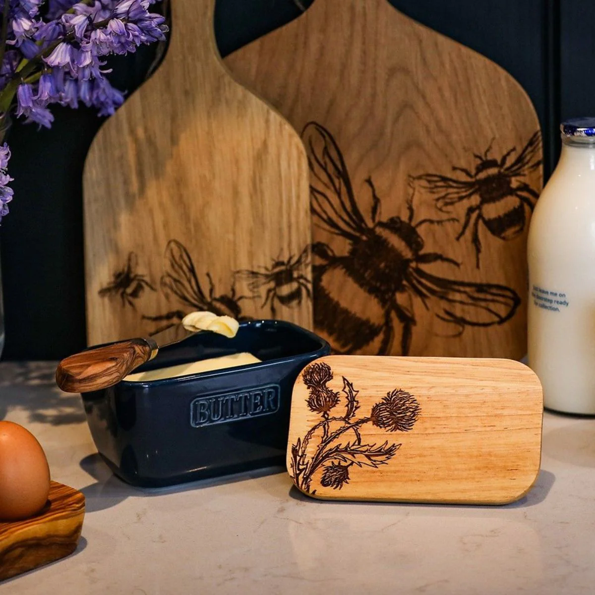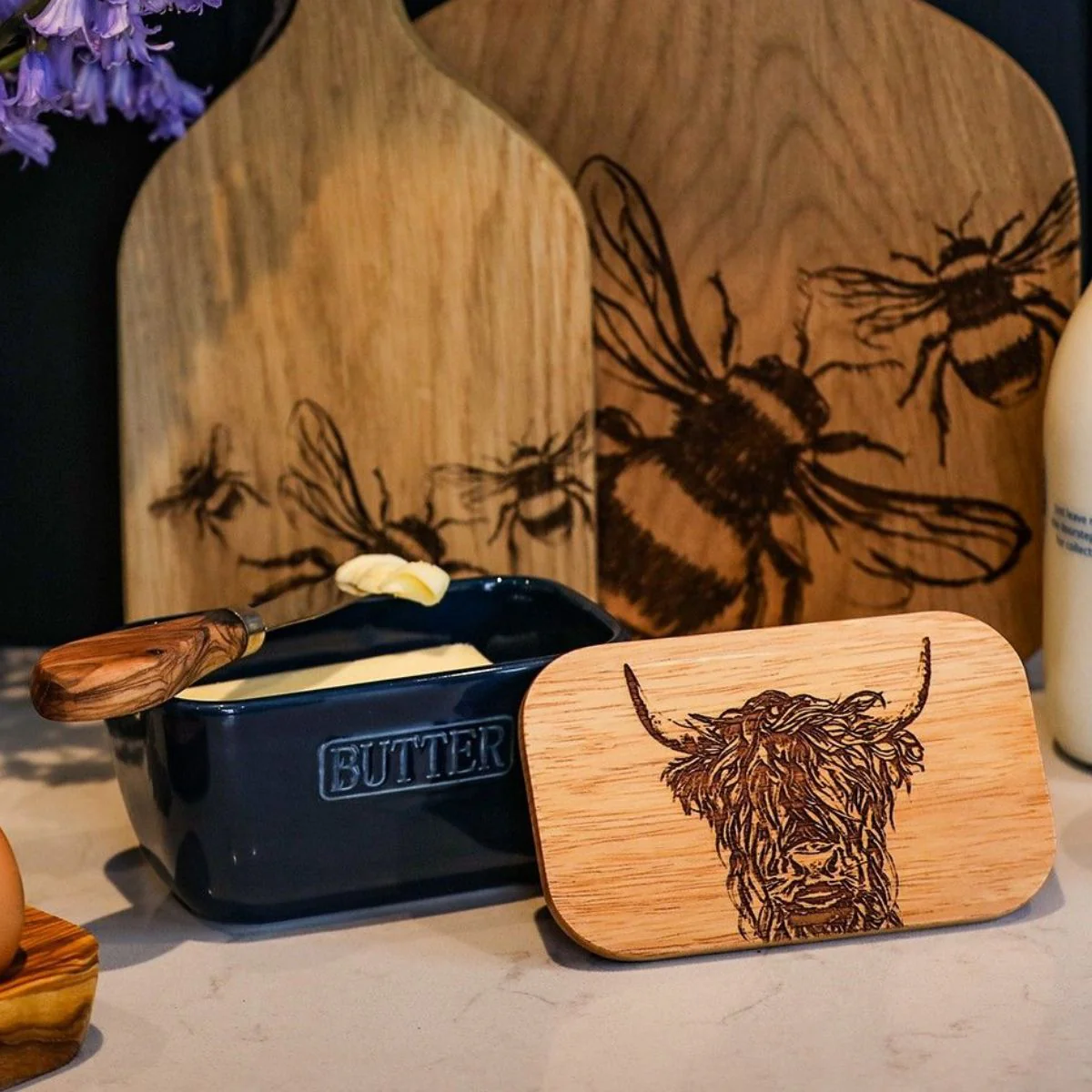 Elige el diseño que prefieras en el color que más te guste. La tapa de madera de roble británico, de origen sostenible y cultivo local, es preciosa con cualquier de sus grabados. Ya sea con la vaca de los Highlands o con la de Jersey, con la abeja dorada o con el cardo, seguro que en cuanto la lleves a la mesa, será el centro de todas las miradas. Además de ser una mantequera perfecta, también es una opción estupenda para conservar el queso.