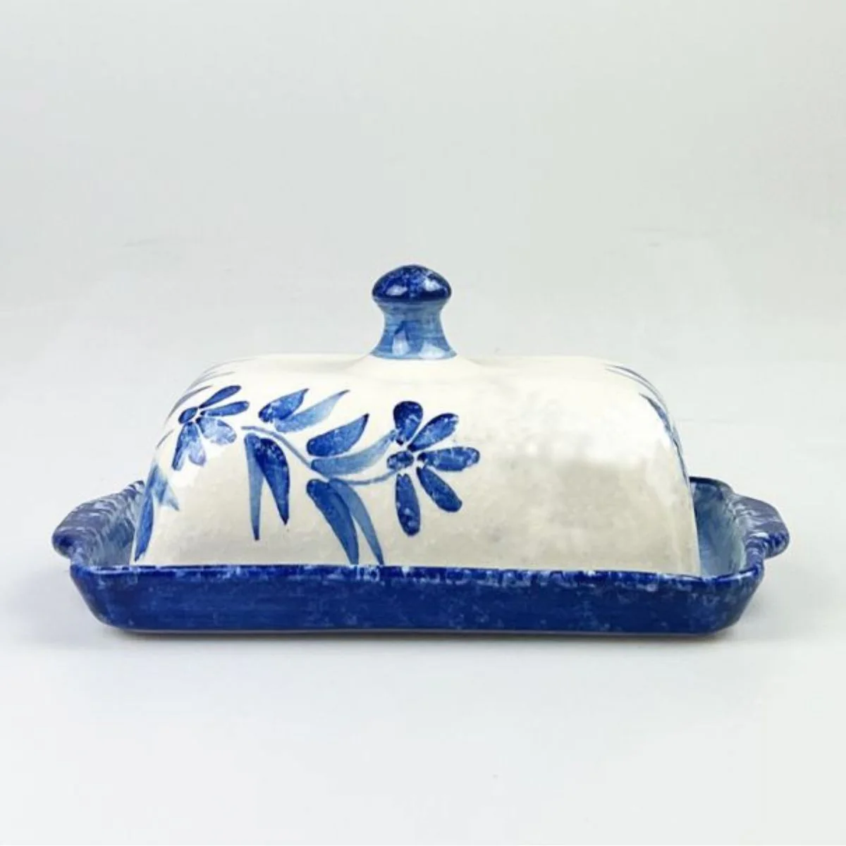 La mantequillera de cerámica combina con maestría el diseño tradicional de bandeja con tapa, con un estampado de olivas delicadamente pintado a mano. Los colores blanco y azul transmiten calma en una mantequera que lucirá en la mesa del desayuno o la de cualquier ocasión. Al estar hecha y pintada a mano, cada mantequillera es única.