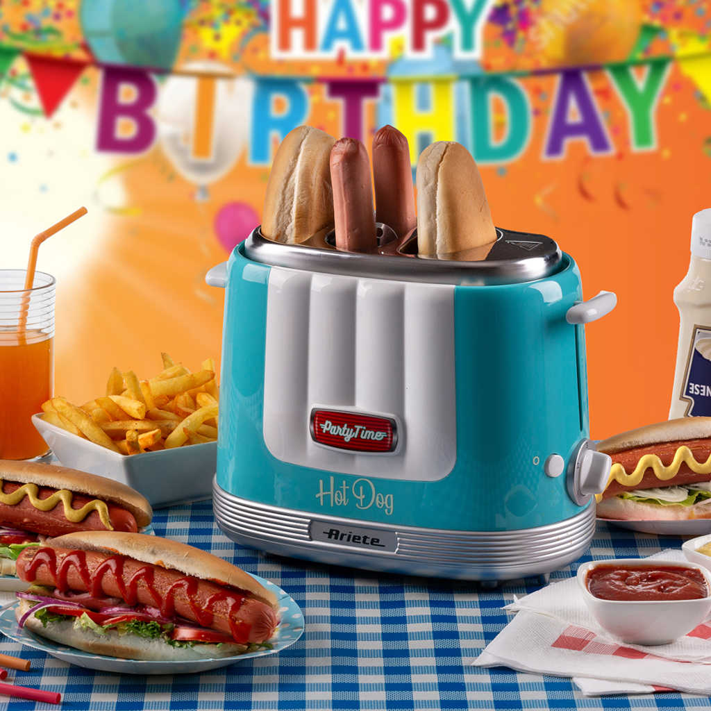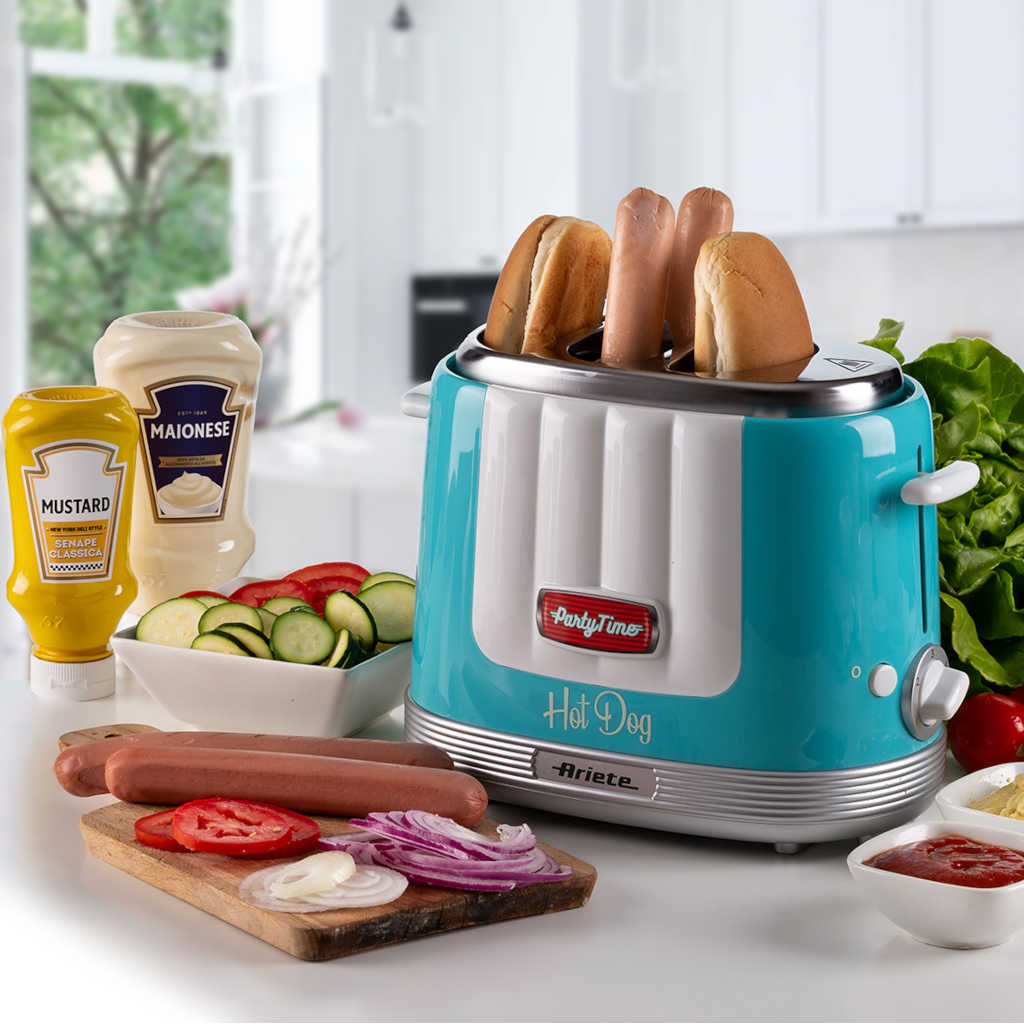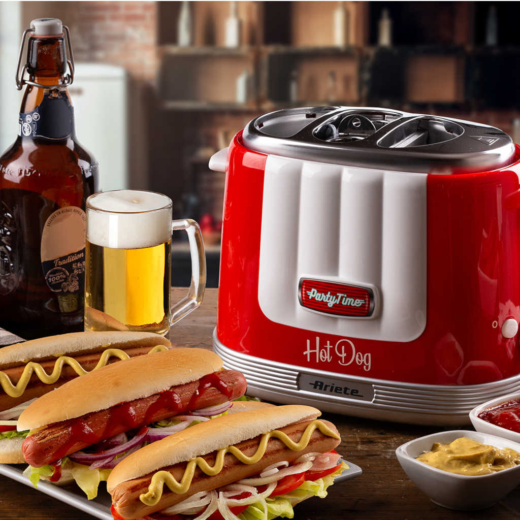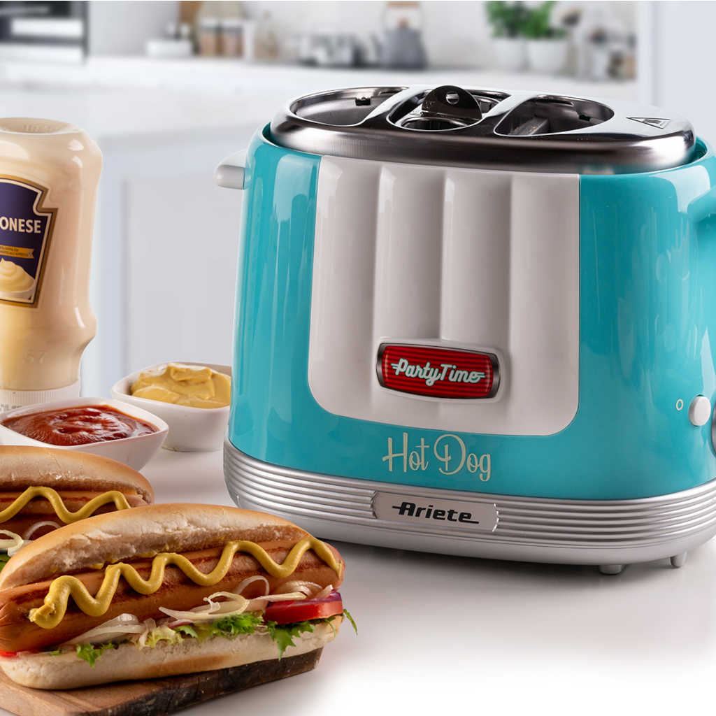 La Máquina de hot dog Party Time Ariete es la solución ideal para preparar dos perritos calientes en un abrir y cerrar de ojos. Su diseño compacto de aire desenfadado es de lo más funcional. Esta máquina eléctrica para hot dogs dispone de espacio para calentar al mismo tiempo dos panecillos y dos salchichas de frankfurt. Y cuando estén, su sistema automático expulsará los panes y las salchichas calientes. ¡Listos para tomar tal cual o con tu salsa favorita!
