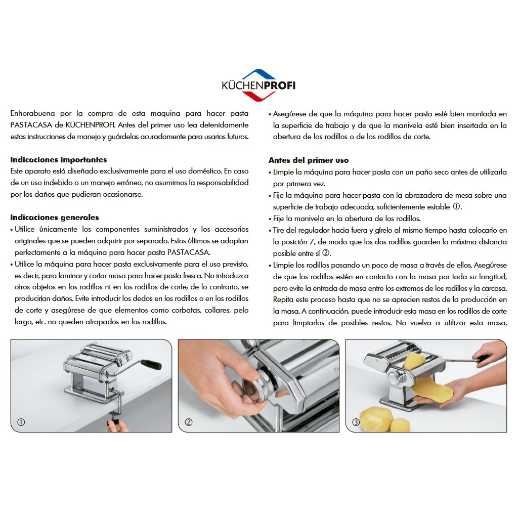 Ante todo, lo importante de hacer pasta con la máquina italiana manual es conseguir una pasta bien prensada, para que, una vez introduzcas la pasta en agua hirviendo, la pasta aguante, no se deshaga. ¡Y esto lo conseguirás a la perfección con la máquina para pasta Küchenprofi!
