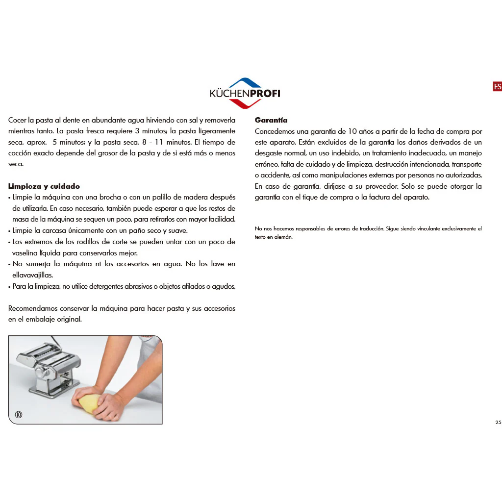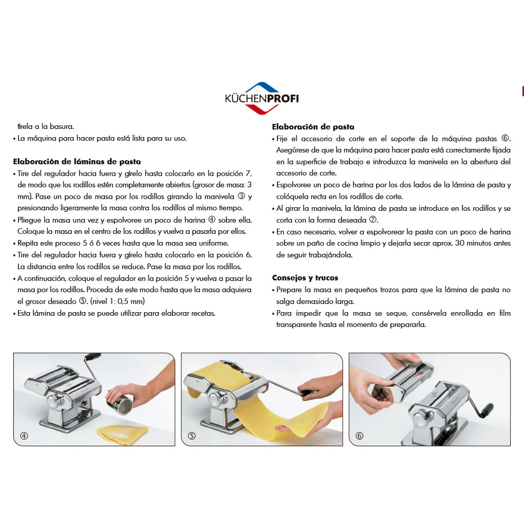 - Función Multiuso: Además de hacer pasta, la máquina puede usarse para preparar otros platos que requieran masa plana (como masas refrigeradas).