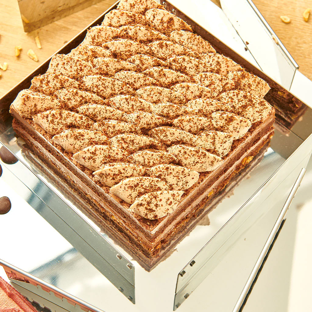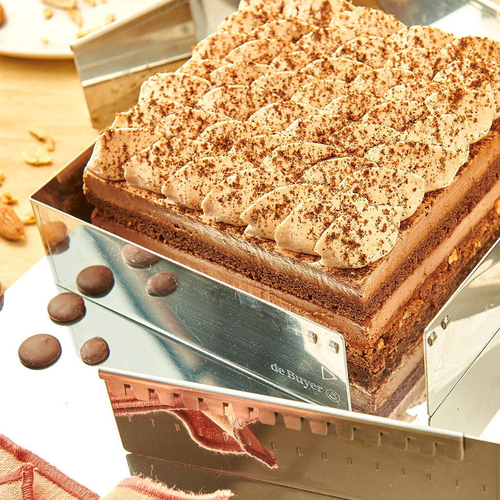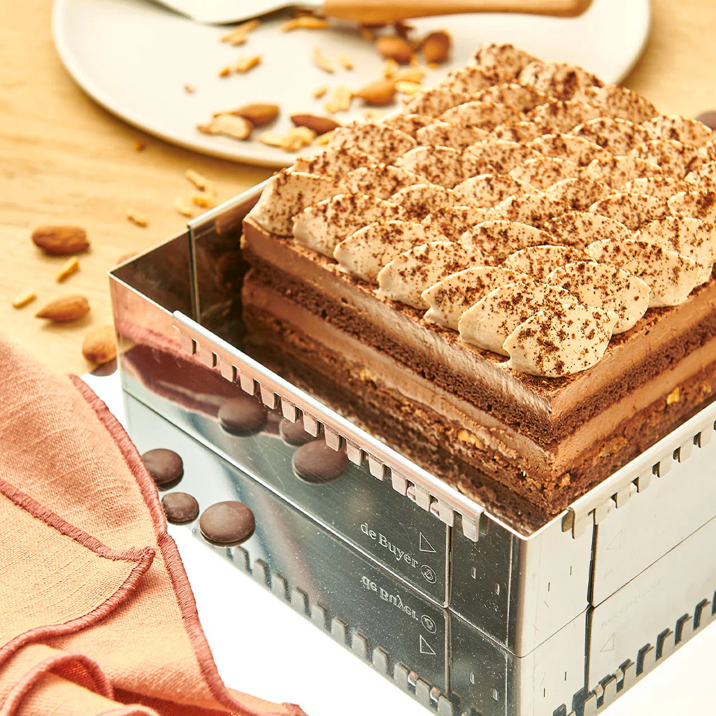 Cuadrada, rectangular, grande o pequeña. Con el Marco de repostería extensible De Buyer tu tarta tendrá la forma que prefieras en cada ocasión con solo un molde. Ajusta la medida que quieras, mantenla con la fijación del marco y ¡crea tus postres!