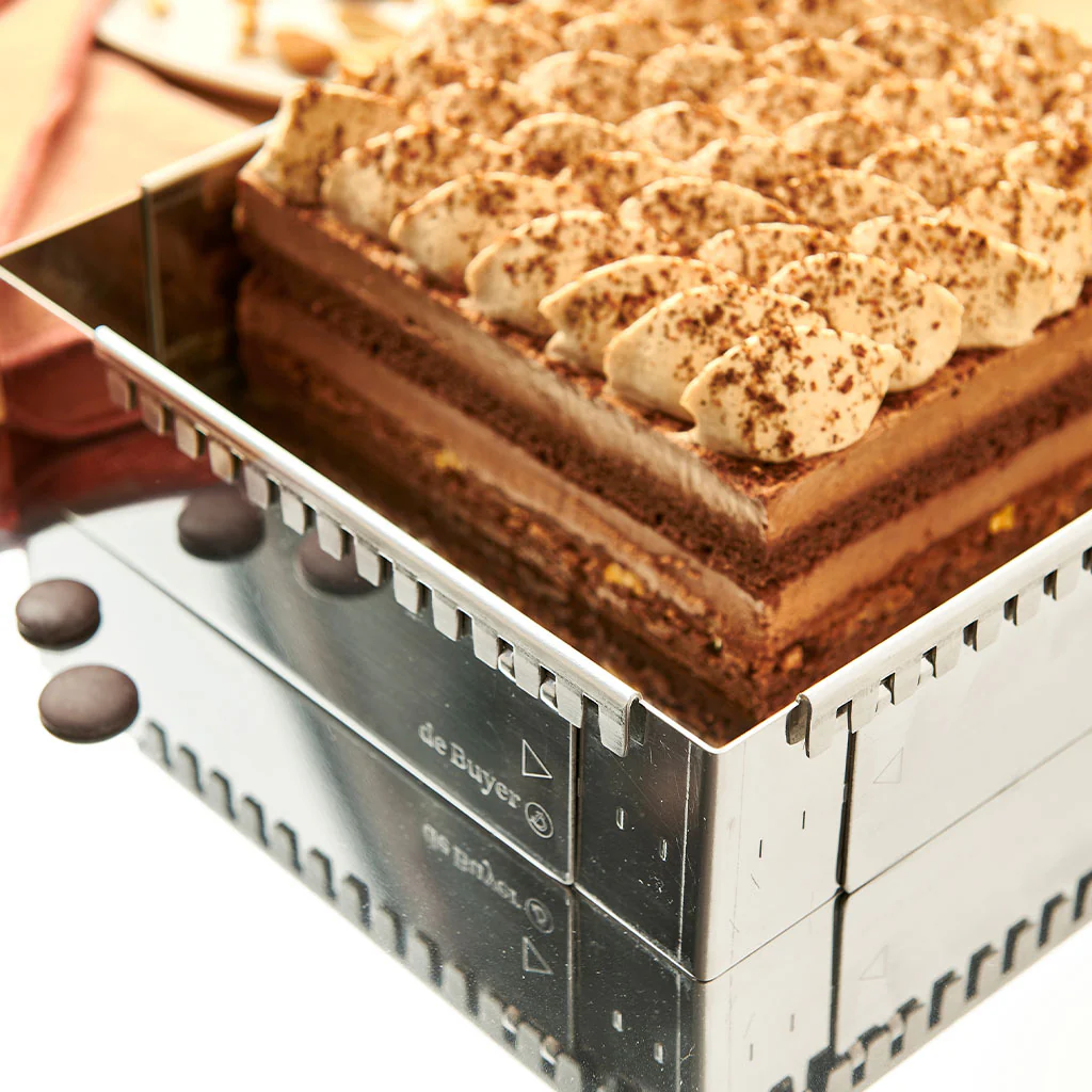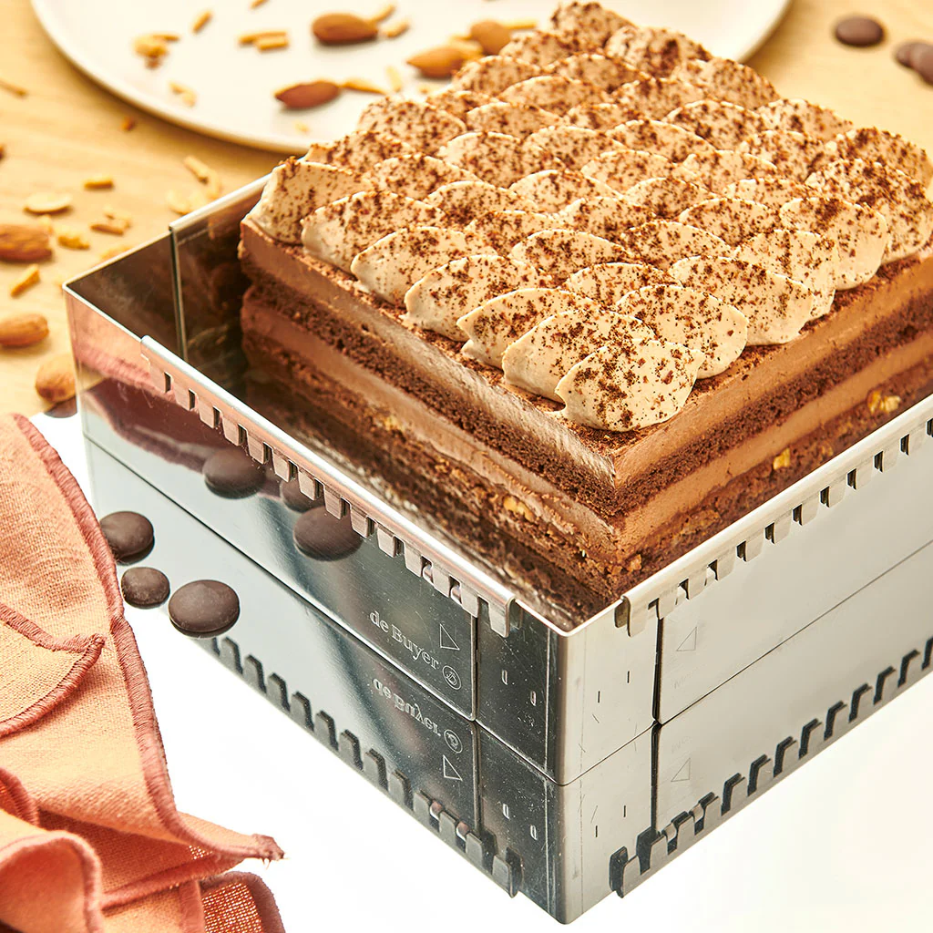 El marco de pastelería, que está fabricado en acero inoxidable, es extensible de 16 cm a 30 cm y te permite obtener formas cuadradas o rectangulares, tanto para tus creaciones en frío como las que requieren horneado.
