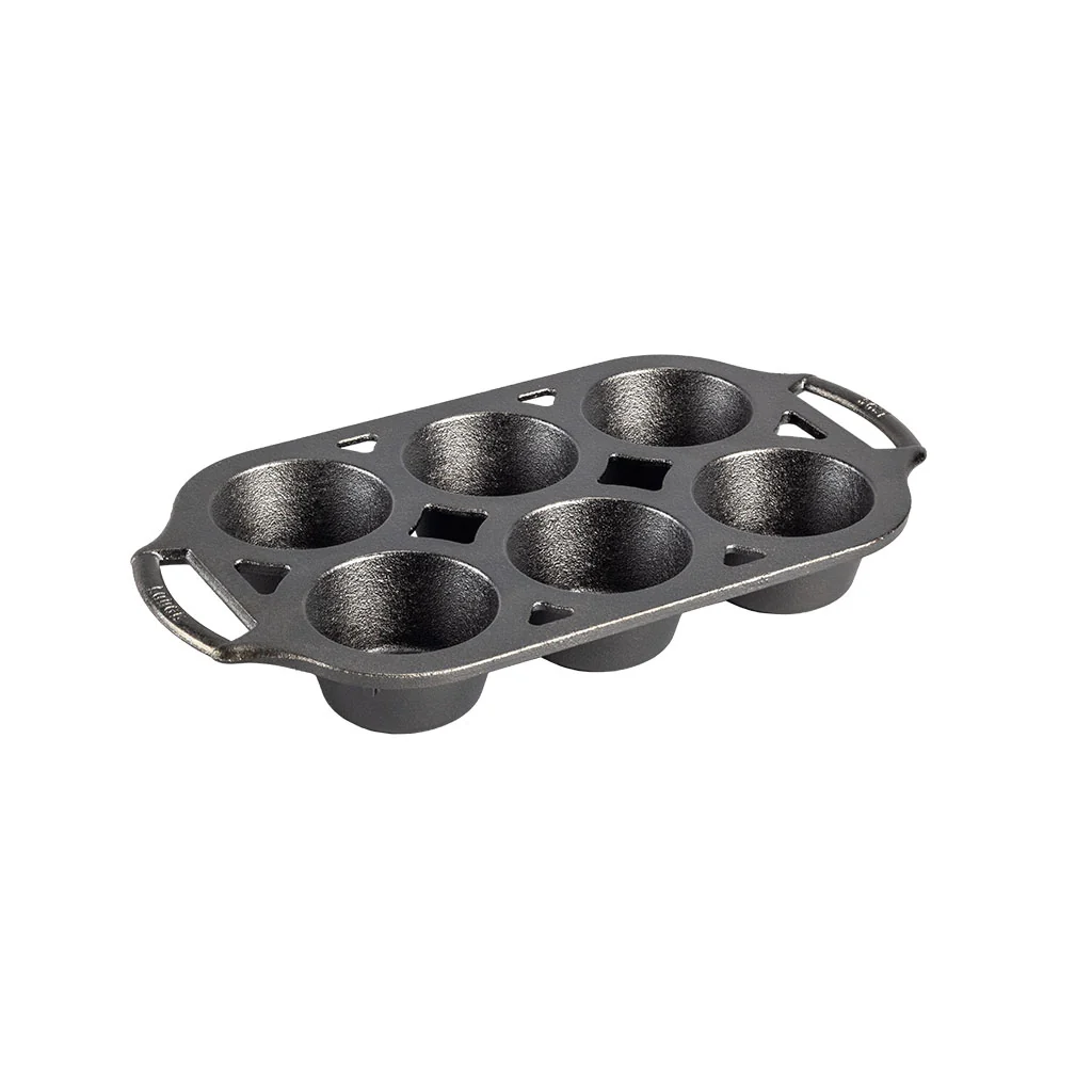 Con el Molde de hierro para 6 muffins Lodge podrás hornear 6 estupendas magdalenas de una sola vez, con el exterior caramelizado y el interior tierno y esponjoso. Este molde de hierro fundido es robusto y duradero. Con él podrás hornear tantas magdalenas o bizcochitos como quieras, sin que se deforme, se abolle o se estropee. Dispone de dos asas para que puedas manejarlo con comodidad y seguridad. Y es también un molde estupendo para tus preparaciones frías de nevera.