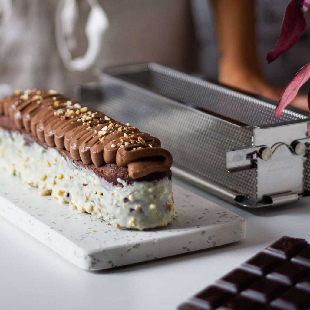El molde desplegable perforado de inox pertenece a la colección Geoforme de De Buyer y ha sido diseñado y fabricado en colaboración con Fabien Pairon, Meilleur Ouvrier de France en 2011.
