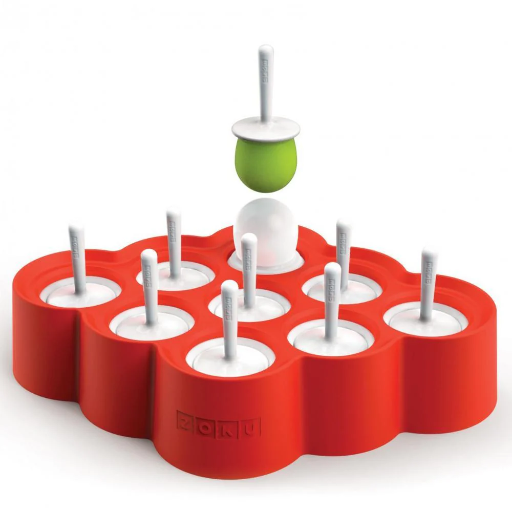 El molde Mini Pops de Zoku permite crear 9 pequeños helados para darnos un pequeño capricho o para los más pequeños. Los moldes para helados tradicionales (como las cubiteras) tienen el inconveniente que a veces se pegan al helado por lo que se hace difícil sacarlos del molde, se rompen al sacarlos, se deben poner con agua caliente, etc. El molde Mini Pops de Zoku permite retirar el helado simplemente tirando del palo gracias a su diseño y materiales. Incluye el molde para 9 helados y 9 palitos con base anti-goteo. ¡Prepara tus propias creaciones y disfruta de los helados más naturales con con tu familia o amigos en cualquier momento!