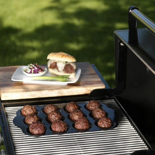 Gracias al diseño redondeado de las cavidades, las albóndigas mantienen la forma mientras se asan y esta curva ayuda a darles la vuelta fácilmente. Las seis perforaciones en la parte inferior de cada hueco permiten que el humo de la parrilla impregne las bolas de carne, al mismo tiempo que elimina el exceso de grasa. No solo saldrán con una perfecta forma redonda, ¡sino que estarán deliciosas y crujientes!