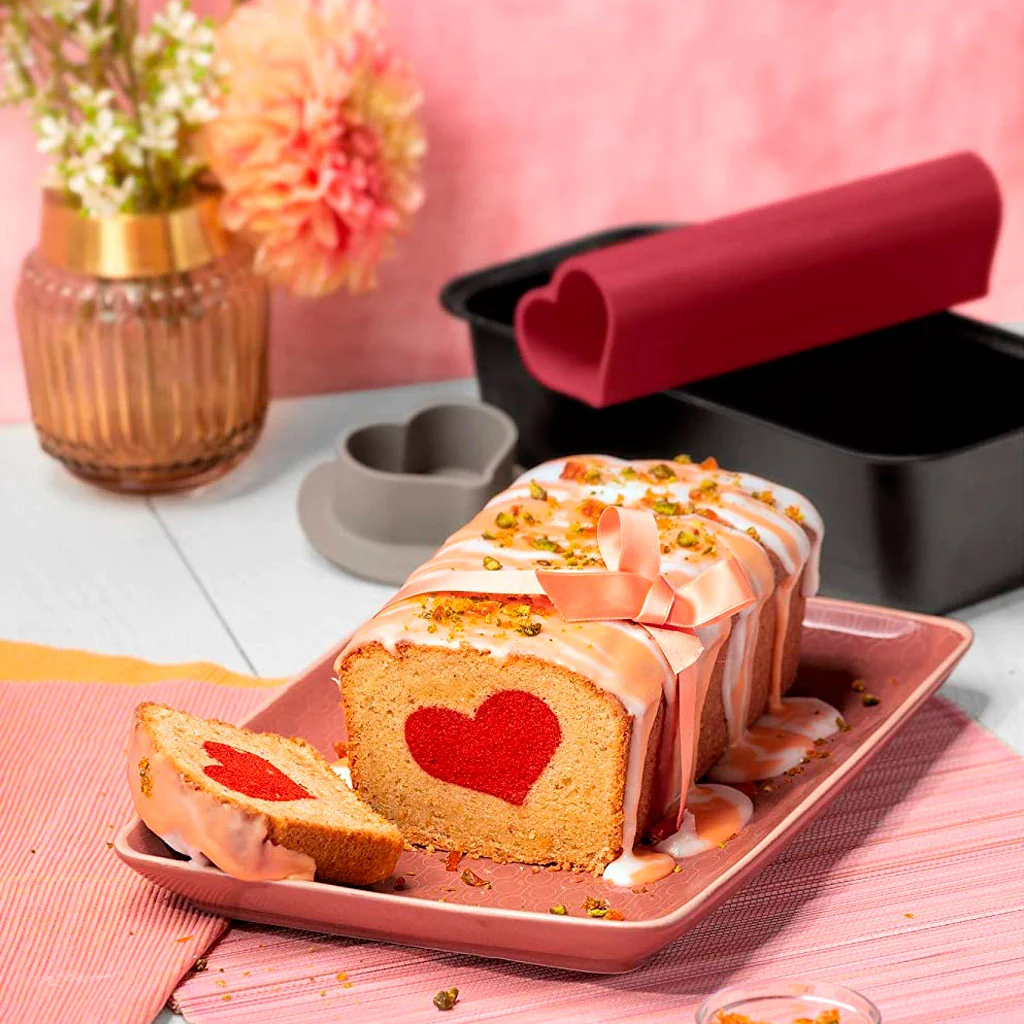 Sin tener que cortar o manipular el bizcocho una vez horneado, este inserto de silicona te permite conseguir un corazón interior a lo largo de todo el plumcake, de una forma tan sencilla como esta: