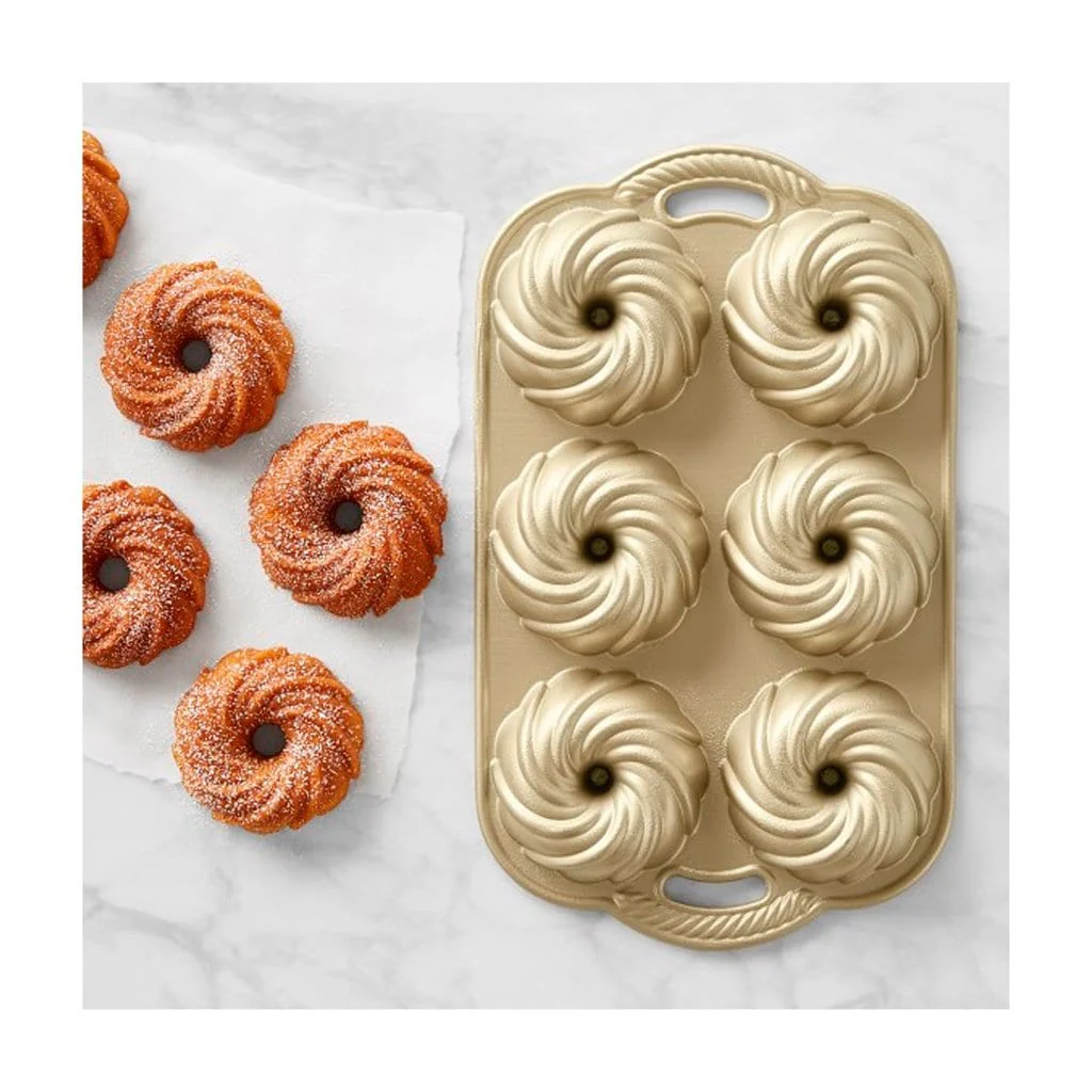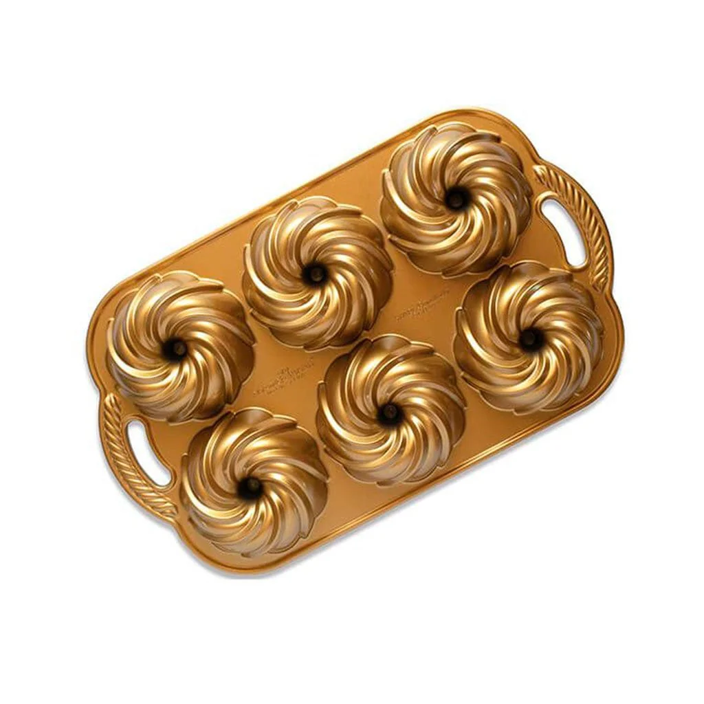Precioso y de lo más elegante en sus formas, el molde dorado Swirl Bundtlette de Nordic Ware es perfecto para preparar seis mini bundts preciosos, y con un tamaño ideal para una porción individual.