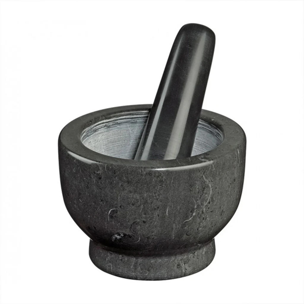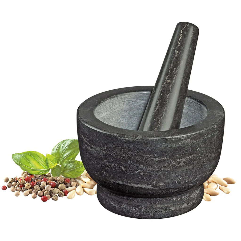 El mortero y la mano están fabricados con mármol de gran calidad, con una preciosa beta. Cuenta con un diseño ergonómico, lo que lo hace muy manejable y permite un agarre muy cómodo y seguro. Su color oscuro le confiere un aspecto muy elegante, perfecto para cualquier cocina. Es duradero y resistente a la abrasión, y su superficie es muy fácil de limpiar, lo que asegura una preparación higiénica de los ingredientes de tus recetas.