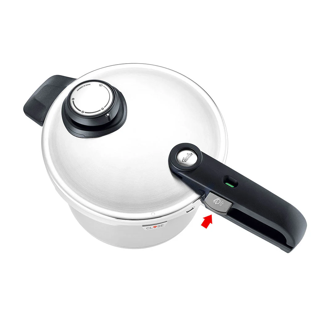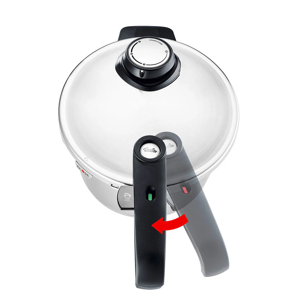 La Olla a presión de 1,8 l Vitavit® Premium Fissler ofrece funciones exclusivas que la hacen muy fácil de manejar y garantizan el máximo nivel de seguridad. Está fabricada en acero inoxidable 18/10 de alta calidad y con acabado satinado, lo que la hace muy duradera e impermeable a la oxidación. Su tapa es muy fácil de colocar gracias a la pestaña de metal que incorpora. Gracias al nuevo diseño del borde de la olla, cerrarla es la cosa más fácil del mundo. Tiene un cierre de seguridad, cuando la olla a presión se cierra correctamente se oye un clic y el indicador de colores del mango pasa del rojo al verde. Mientras eso no se cumpla, no se comienza a acumular presión.