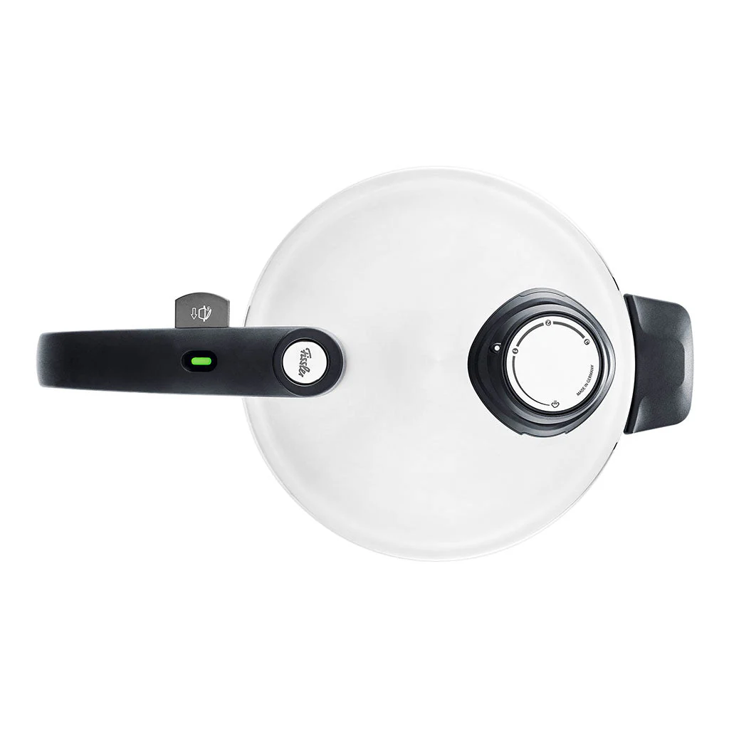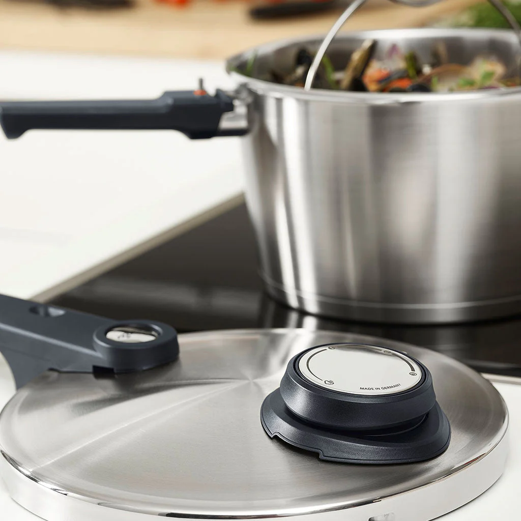 La línea Vitavit® Premium ofrece una innovadora función de cocción al vapor. Funciona sin presión, de modo que podrá echar un vistazo a los alimentos, removerlos y sazonarlos en cualquier momento. Con la válvula de cocción con sistema de semáforo tricolor, cocinar con la olla a presión es simple y seguro. Amarillo, ya se puede bajar la intensidad del fuego; verde se ha alcanzado la temperatura fijada y empieza a descontarse el tiempo de cocción y rojo la temperatura es demasiado alta y se debe bajar la presión.