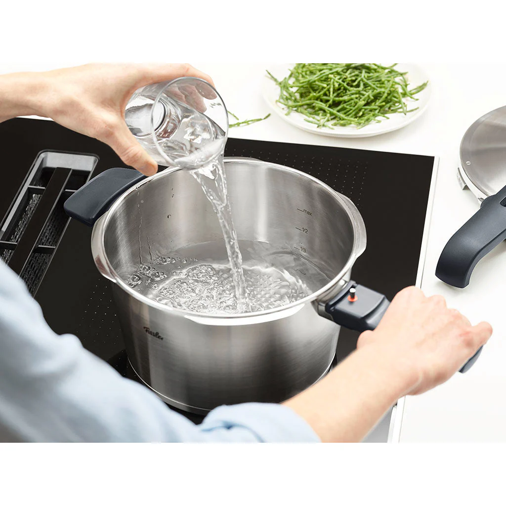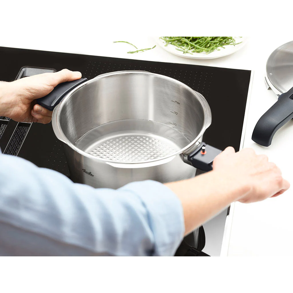 Los modelos de la línea Vitavit® Premium están equipados con un mango ergonómico de tipo lazo. Así se garantiza la seguridad al manipular la olla, incluso con las manos mojadas o manchadas de grasa. Con escala medidora interior, la olla incorpora un indicador de nivel de llenado muy práctico, situado en su interior, que señala los niveles mínimo y máximo de líquido. Su mango desmontable facilita el trabajo a la hora de limpiar y guardar la olla a presión. Una ventaja muy práctica para guardar varias ollas o cazuelas en el armario: se pueden apilar encajándolas unas encima de otras.