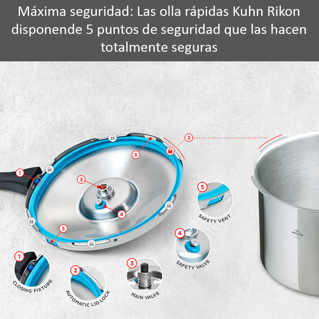 - Sistema de bloqueo de tapa que no permite abrirla si todavía hay presión en la olla.