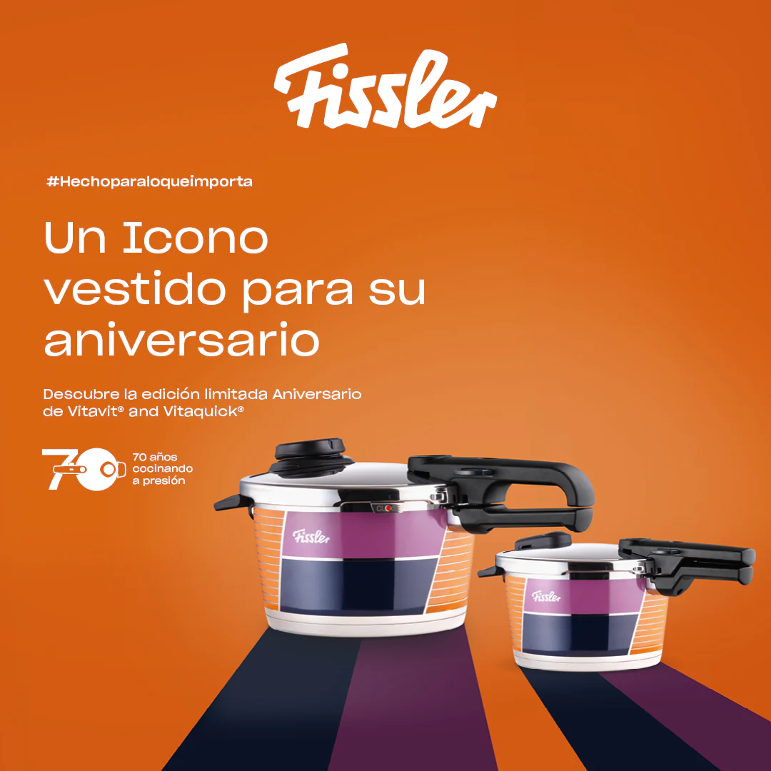 Elegantemente vestida de fiesta, la Olla a presión Vitavit® Edición Aniversario Fissler se presenta en una edición limitada para celebrar su 70 aniversario. Esta versátil olla rápida, de fácil funcionamiento y gran calidad, llenará tu cocina de color y de recetas saludables, rápidas y deliciosas. Sus funciones exclusivas la hacen muy fácil de manejar y garantizan el máximo nivel de seguridad y el mínimo consumo energético. Una pieza icónica vestida con los colores y a la moda de los años 50, cuando empezó su historia.
