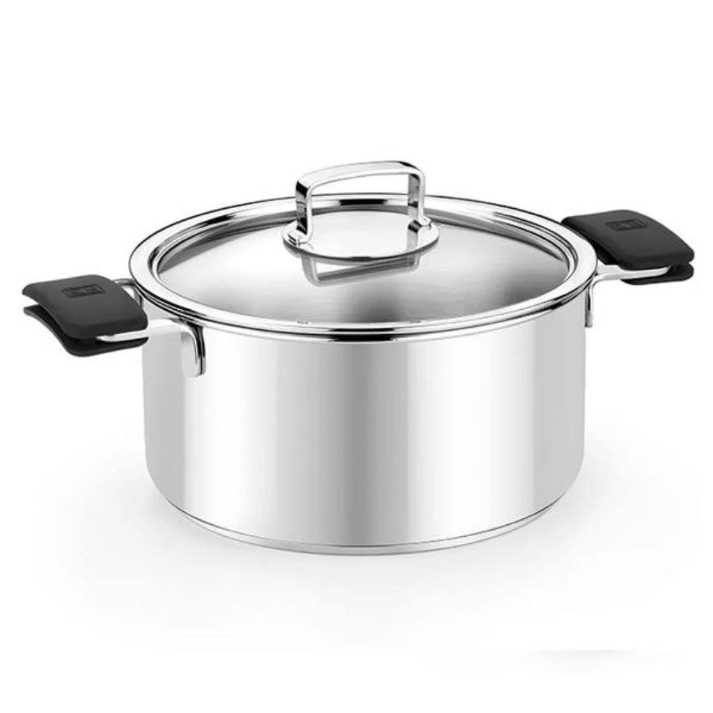 - Olla de acero inoxidable con tapa de vidrio y embellecedores de inox.
