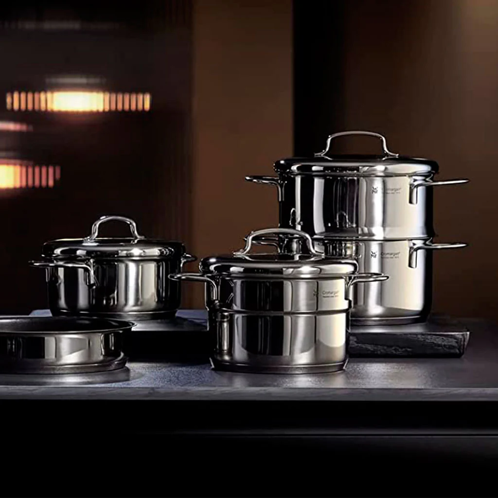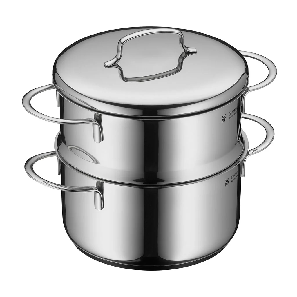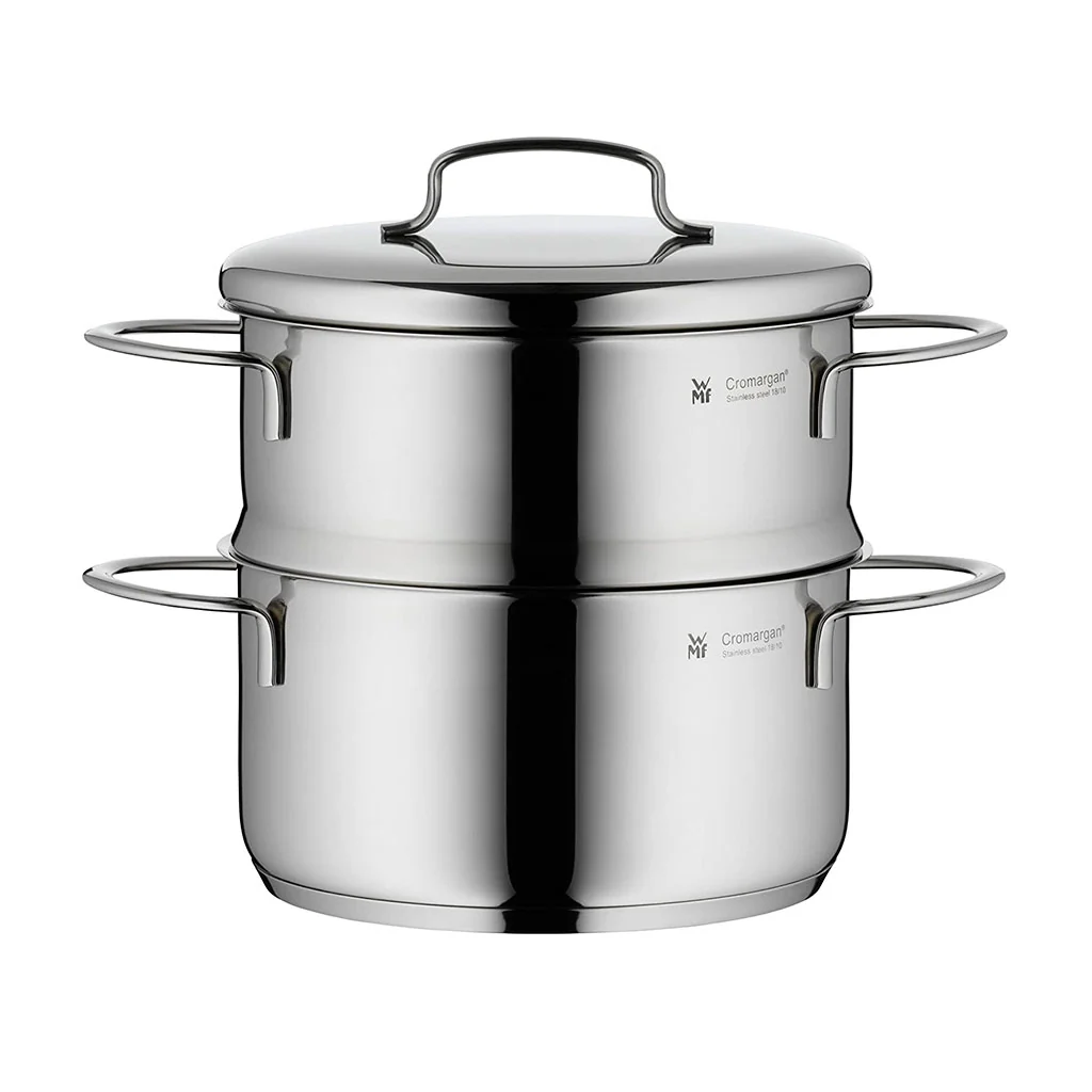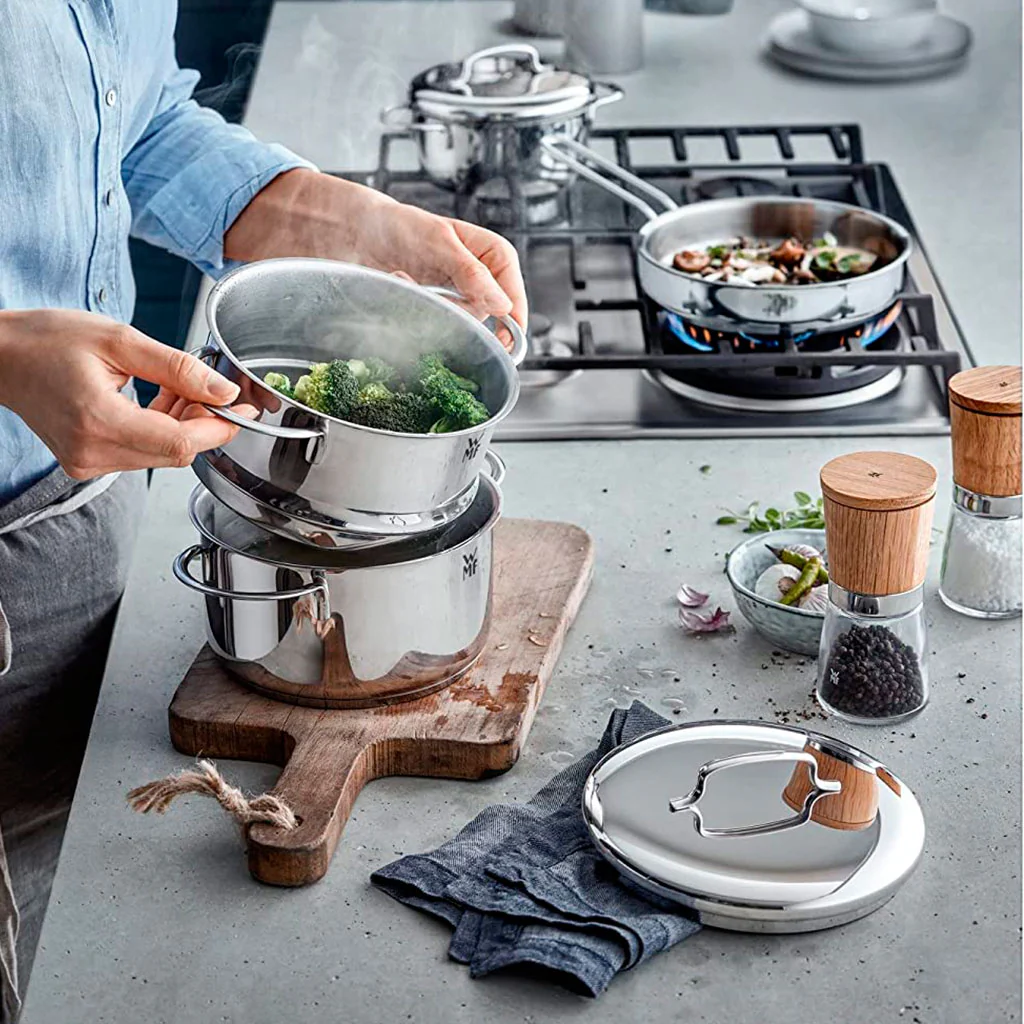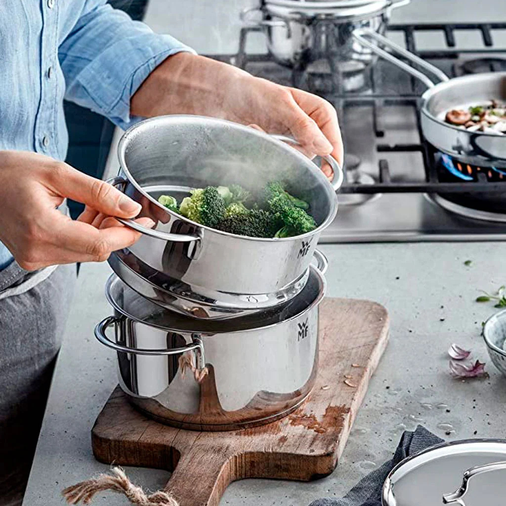 La Olla con interior cocción vapor de WMF es una olla baja con tapa y cesto de vapor, ideal para preparar tus recetas más saludables. Este conjunto de tres piezas de acero inoxidable es perfecto para cocinar al vapor y también para elaborar cualquier tipo de receta, desde purés y cremas, pasta y arroz, guisos de legumbres y estofados, e ¡incluso frituras!