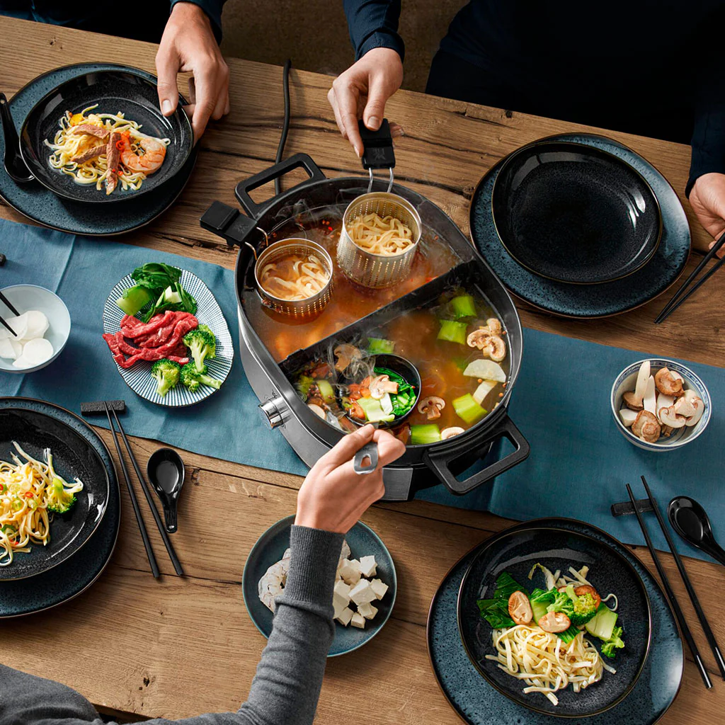 Con la Olla Hot Pot de WMF vas a disfrutar como nunca de la cocina sabrosa, saludable, divertida y relajada. Esta estupenda fondue china con accesorio para cocinar al vapor, tiene un elegante diseño y una gran funcionalidad. Con solo enchufarla, llevará al centro de tu mesa los sabores y aromas de los guisos de caldo, carnes, verduras o pescados más deliciosos, ya sean de inspiración asiática, ¡o reinventados a tu gusto!