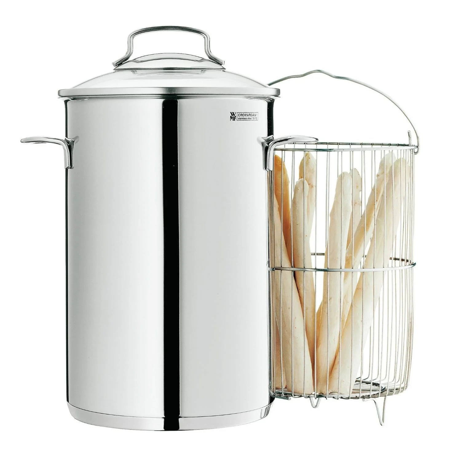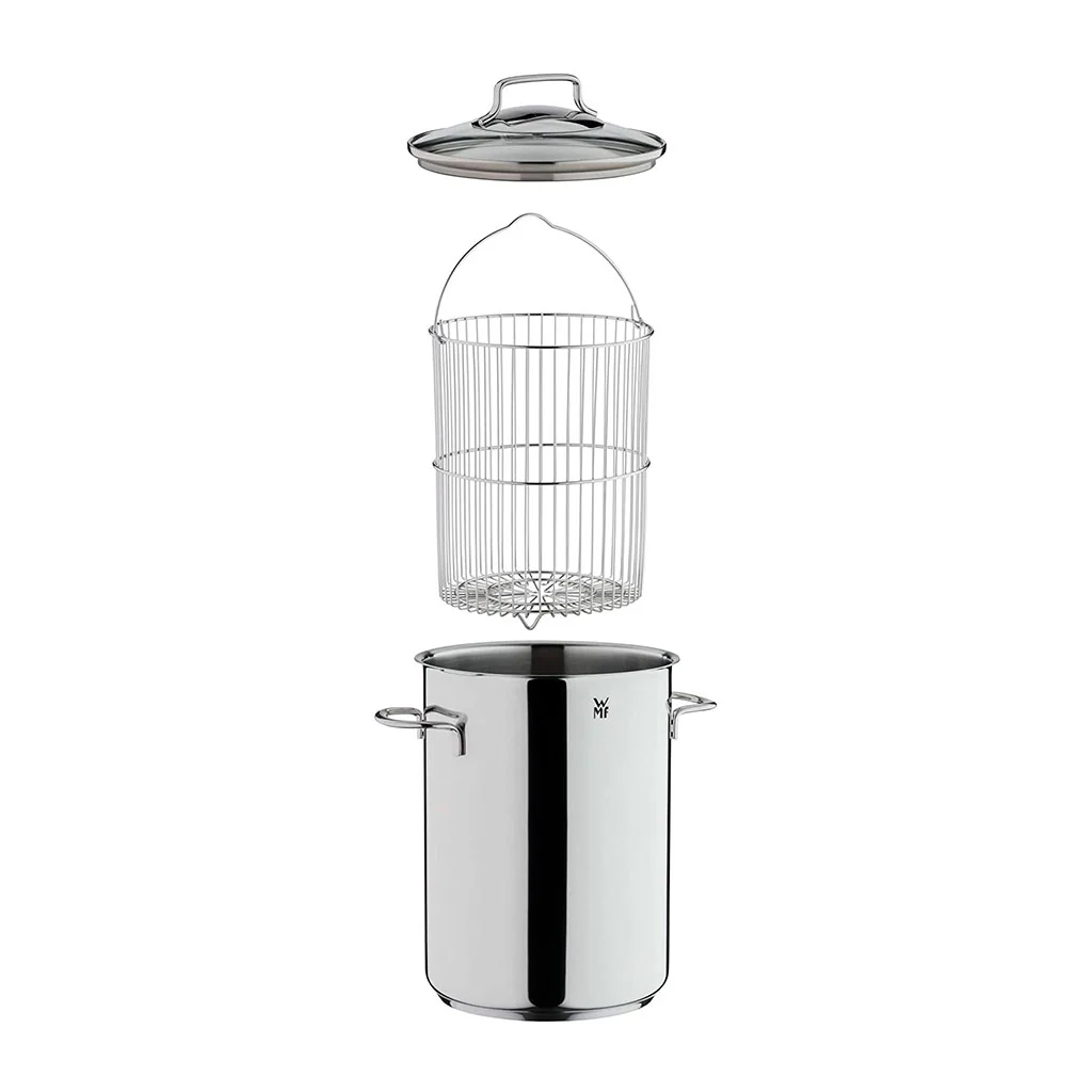 La olla para espárragos es un conjunto muy funcional, formado por una olla alta de acero inoxidable 18/10 Cromargan®, una tapa de cristal y acero inoxidable y una cesta de alambre con asa, que se inserta en el interior de la olla para cocer de manera muy práctica los espárragos.