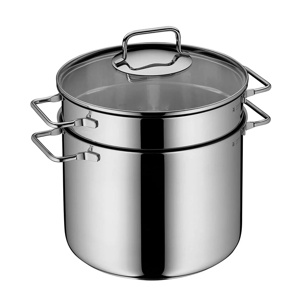 Es una olla muy versátil, tanto para tus recetas de pasta, como para cocinar al vapor tus platos más saludables o unos ricos postres, para cocer legumbres o hacer caldo de forma muy práctica, utilizando la cesta perforada para ganar tiempo al colarlo; o con la olla sin la vaporera preparar tus mejores cremas de verduras o unas lentejas estofadas.