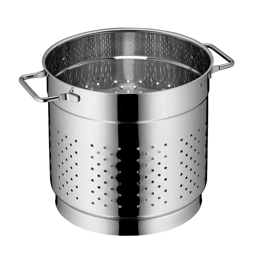 Si adoras los espaguetis, los macarrones o un buen plato de ravioli, la Olla para pasta Profi Plus de WMF será tu mejor compañera en la cocina. Este set de tres piezas es una tradicional pastaiola, e incluye una olla alta, una tapa y una olla con agujeros, a modo de cesto colador o vaporera, ideal para preparar, hervir y colar la pasta una vez cocinada.