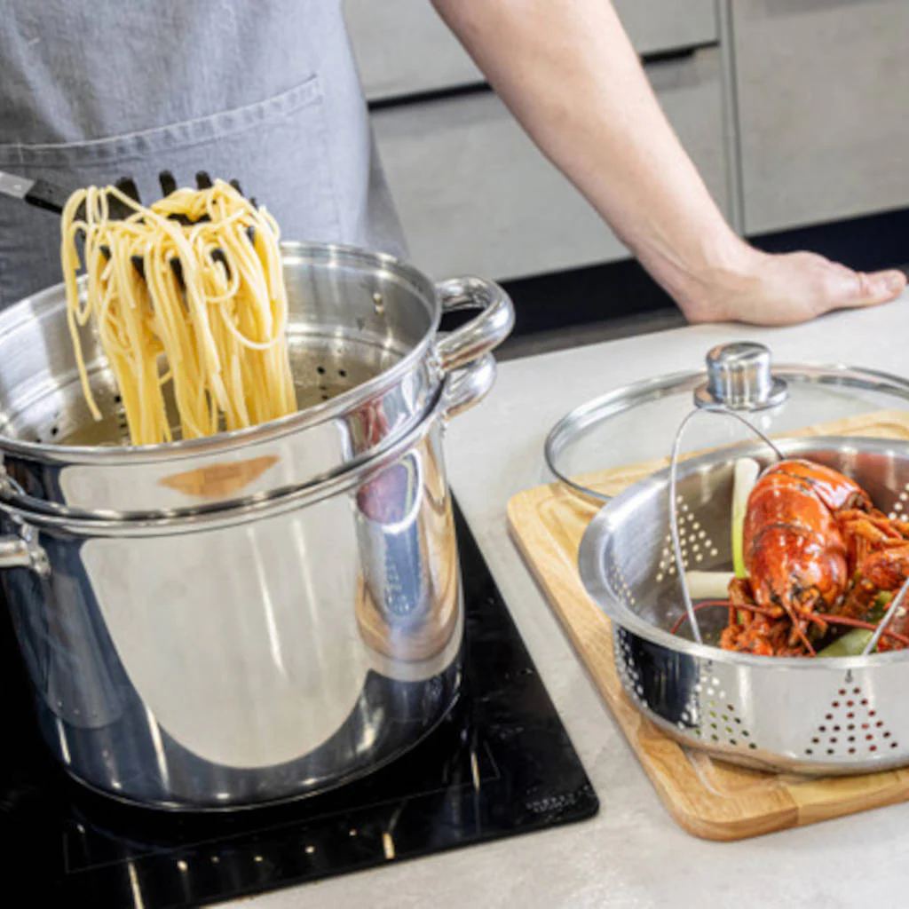 El set es completo y de lo más práctico -¡Incluso podrás cocinar dos platos a la vez! Mientras estás cociendo pasta o arroz en agua hirviendo en la olla grande con colador de pasta, el vapor de esa misma cocción cocerá pescado blanco o un filete de salmón y verduras en el cesto vaporera. ¡Es un set de lo más práctico!