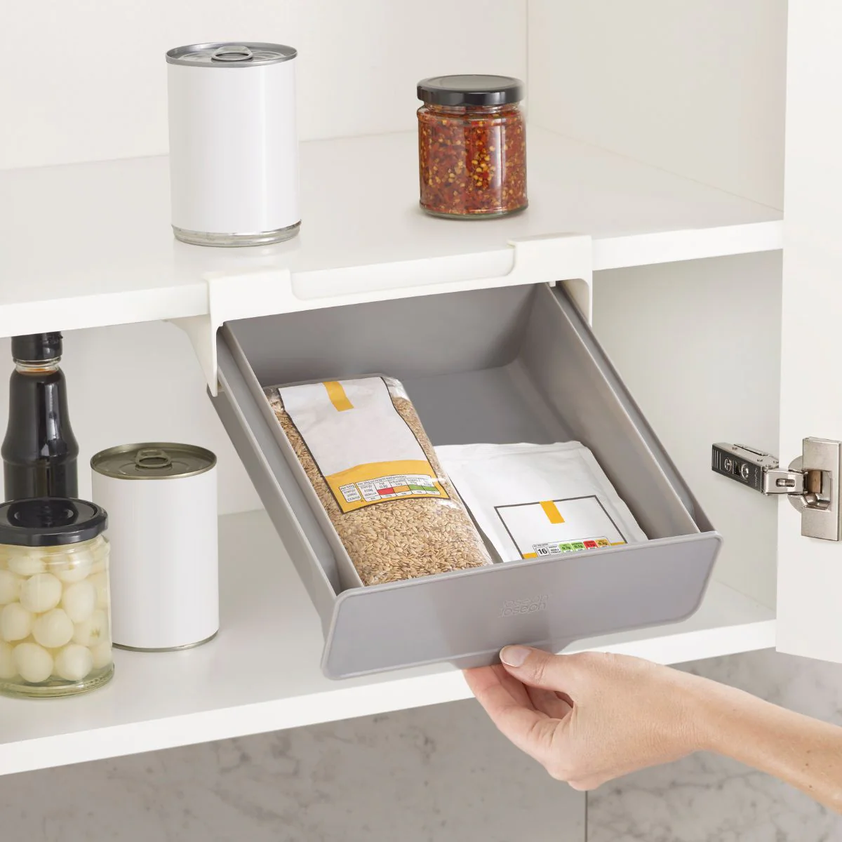 Su diseño compacto y funcional permite guardar todo tipo de utensilios de cocina, así como conservas de tu despensa como pasta, latas u otros encurtidos, de forma ordenada y accesible. Es muy fácil de instalar, ya que su diseño le permite acoplarse perfectamente a los estantes de los armarios, lo que te concederá obtener un cajón adicional en la cocina.