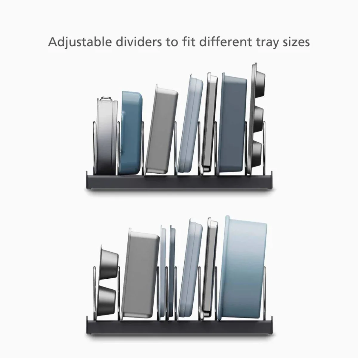- Organizador ajustable para bandejas, moldes, sartenes y fuentes.