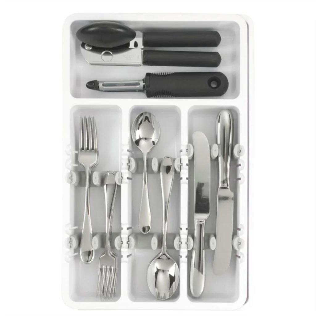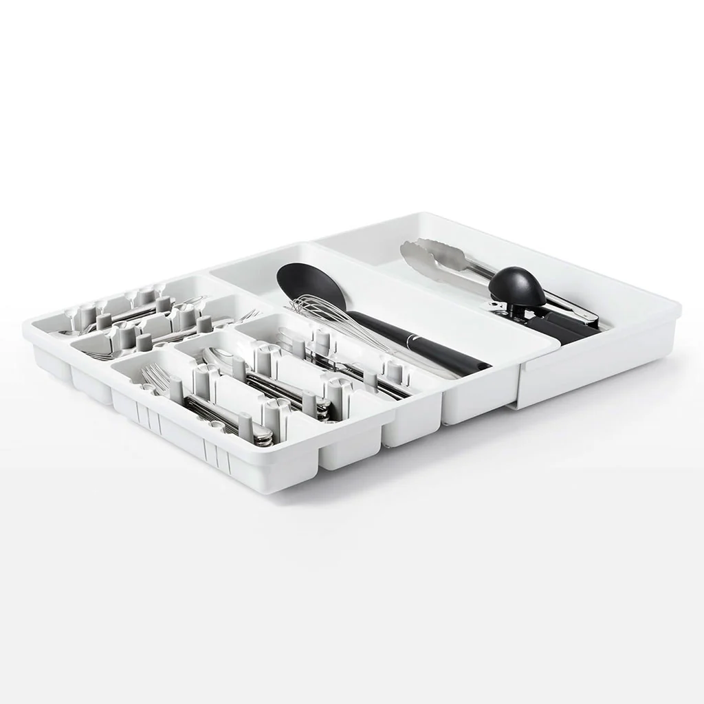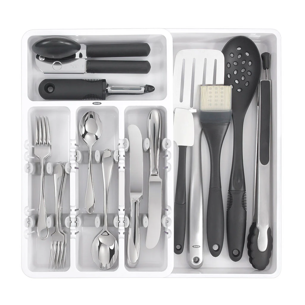 El Organizador de cubiertos extensible OXO es la solución ideal para mantener tus cajones perfectamente organizados y aprovechar cada centímetro de espacio. Este práctico organizador se expande lateralmente, adaptándose a cajones de diferentes tamaños, lo que lo convierte en una herramienta versátil para cualquier cocina.