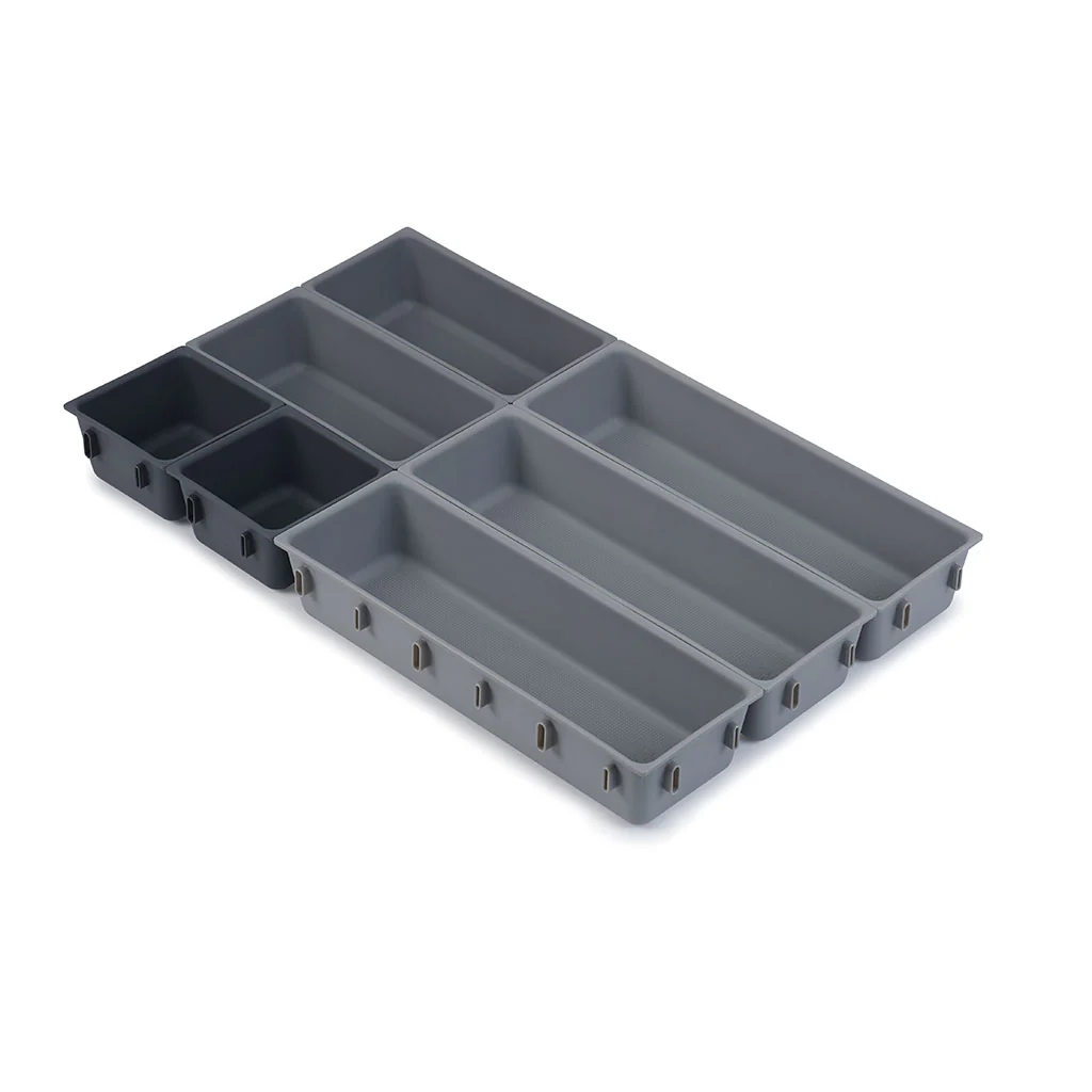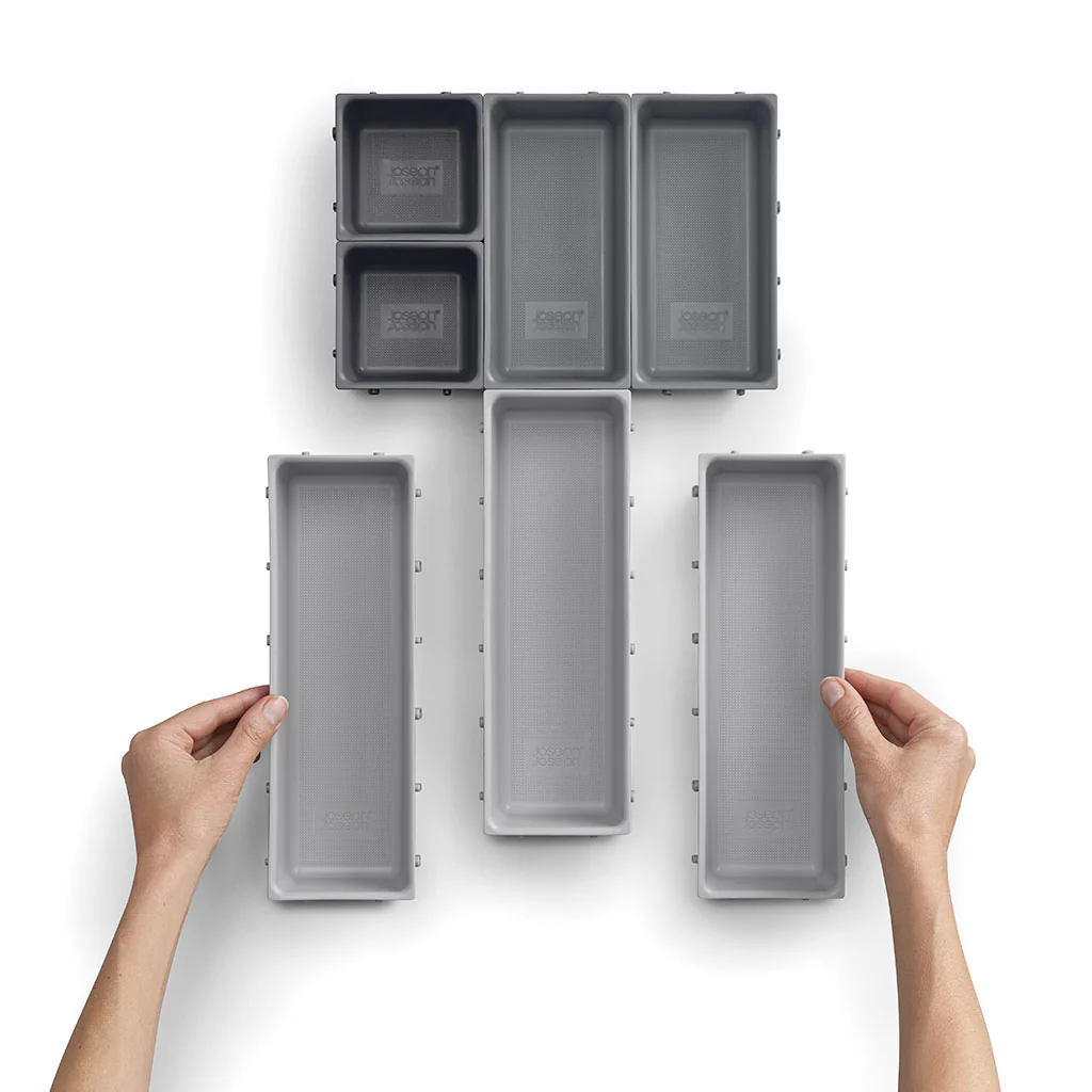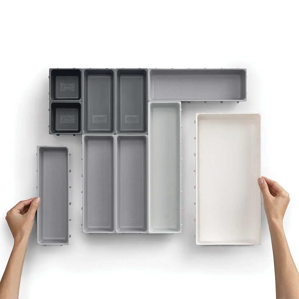 El set de Organizadores de cajones Blox Joseph Joseph es un conjunto de bandejas independientes, perfecto para tener tus cajones siempre ordenados. Cada juego está formado por bandejas que encajan entre sí por cualquiera de sus lados. Las bandejas tienen diferentes tamaños y podrás colocarlas en tus cajones como prefieras, para aprovechar al máximo el espacio disponible. Con este sistema de organización modular, ¡no habrá rincón sin ordenar!
