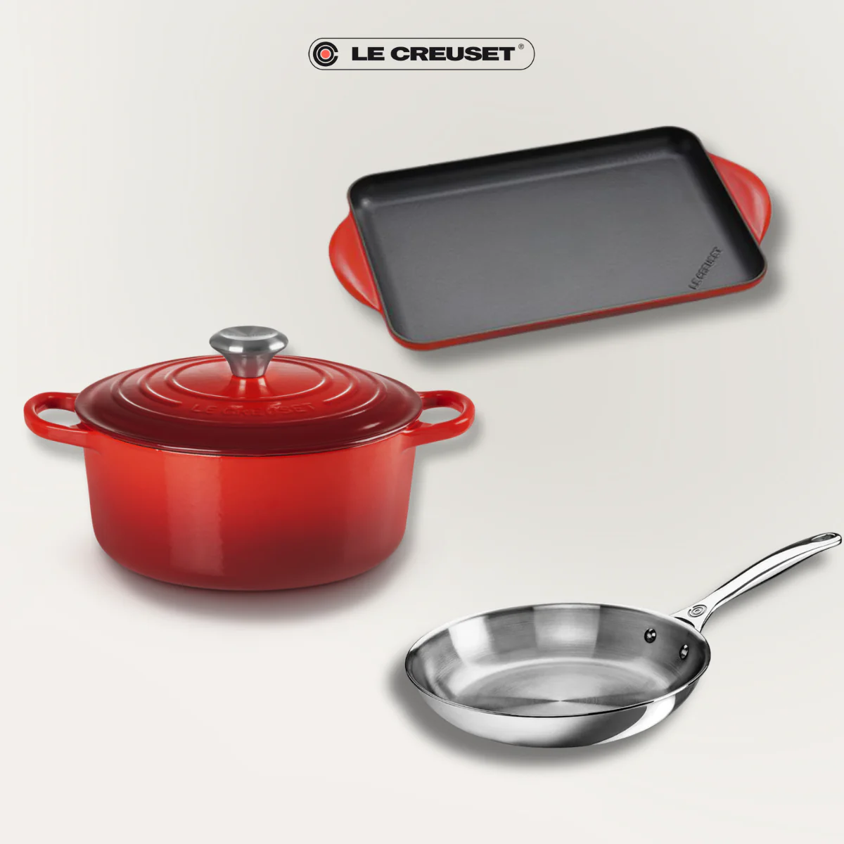 ¡El pack más completo! Tres piezas icónicas de Le Creuset —una cocotte de hierro fundido, una parrilla lisa y una sartén de acero inoxidable tricapa— en un conjunto elegante, versátil y atemporal. Te permitirán cocinar prácticamente cualquier receta para todas las ocasiones.