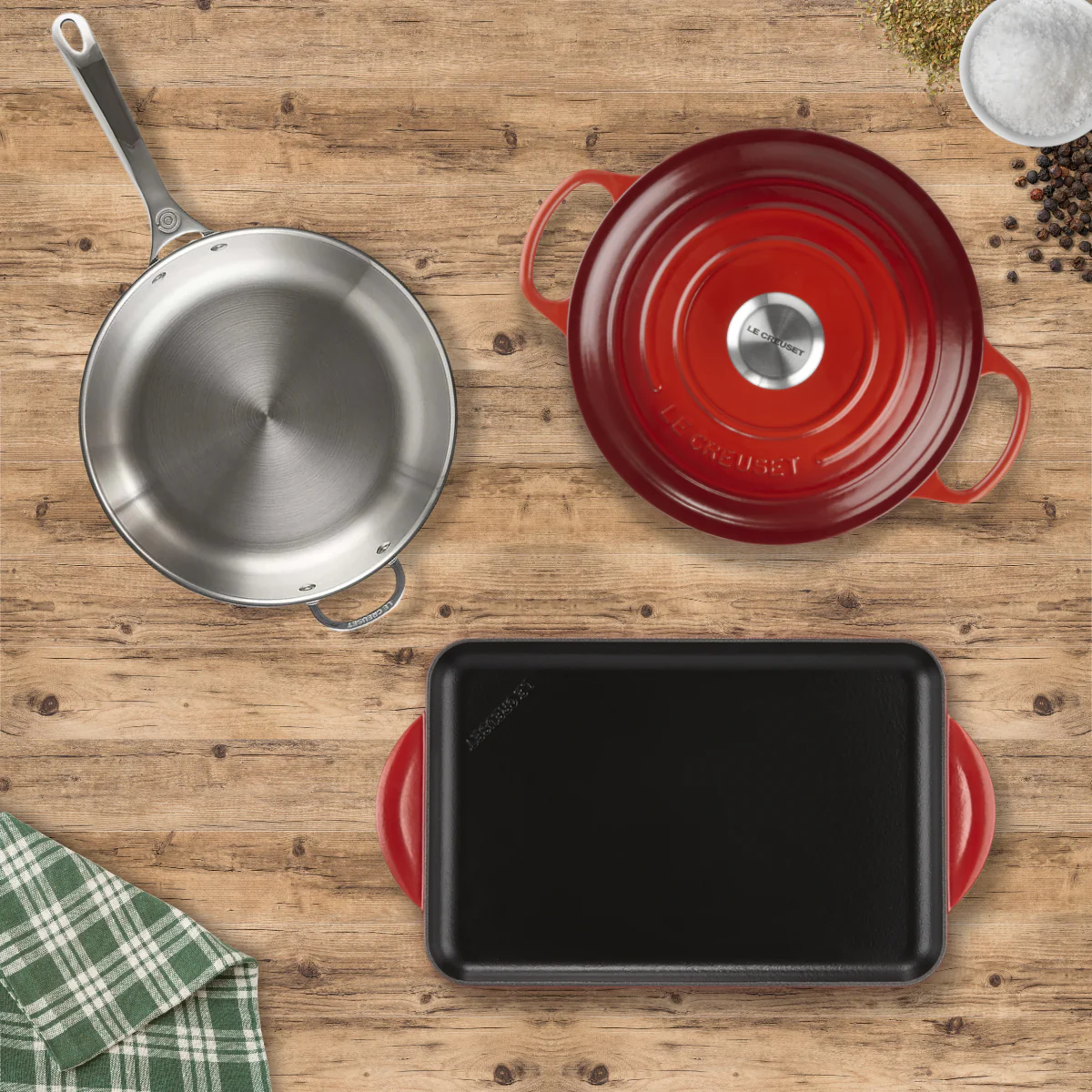 Pack Completo Le Creuset: Cocotte + Parrilla de hierro + Sartén inox 3-Ply