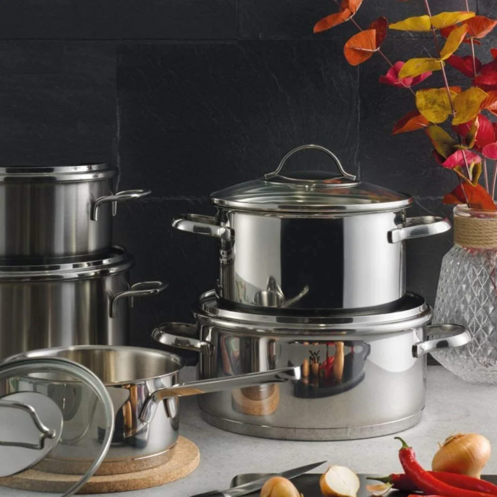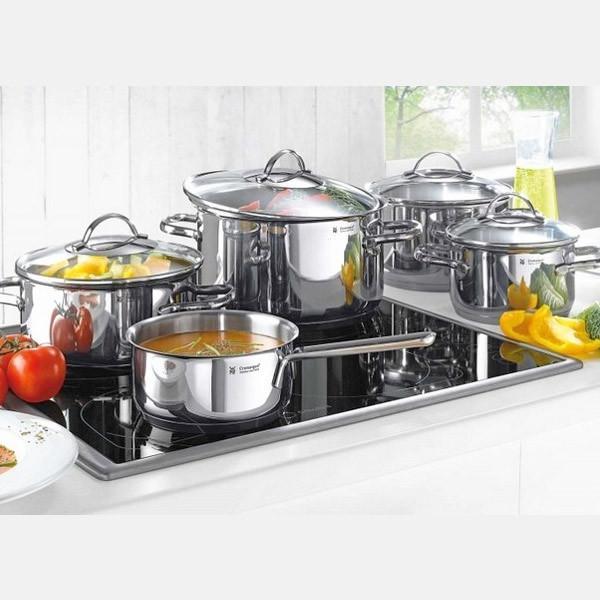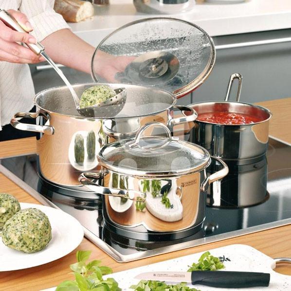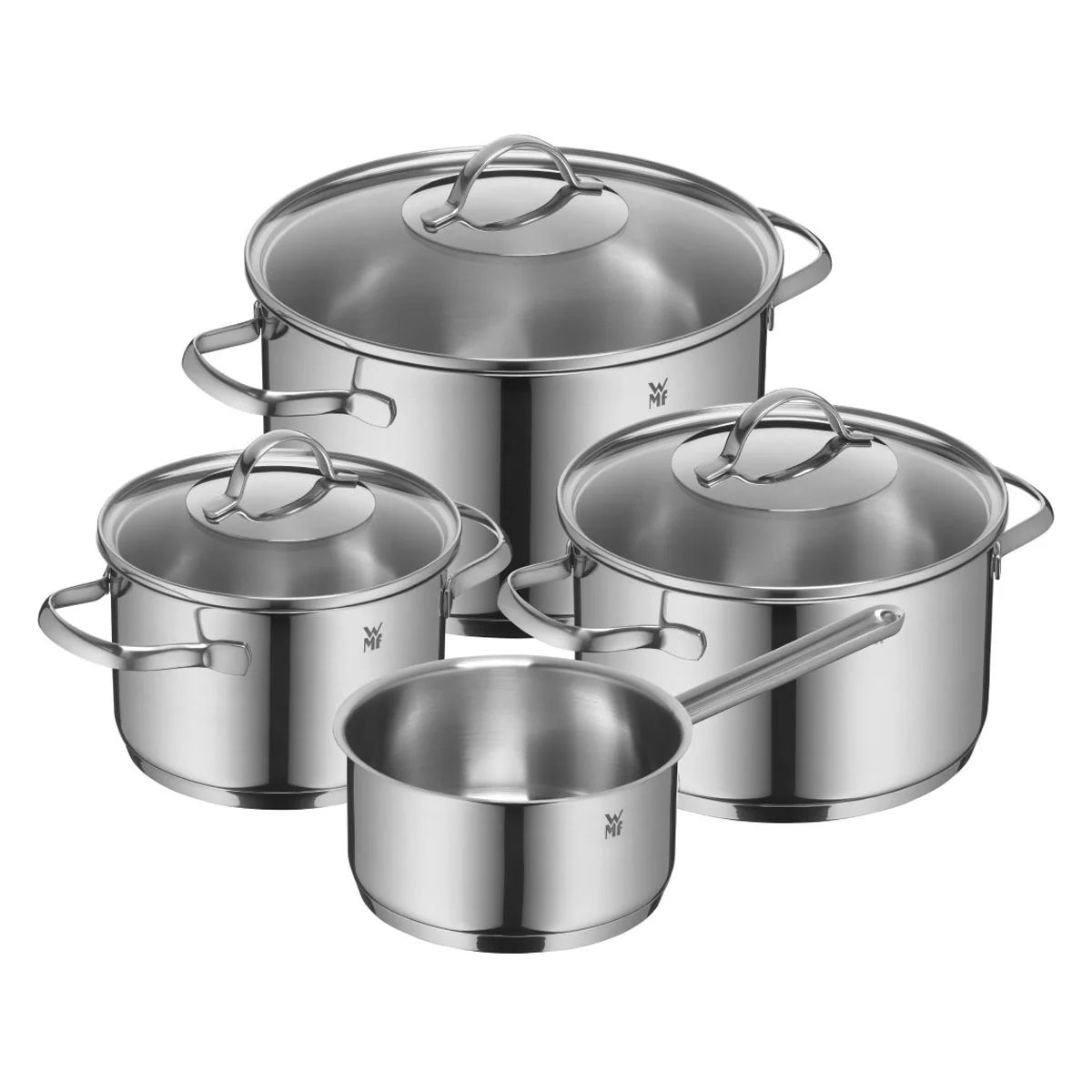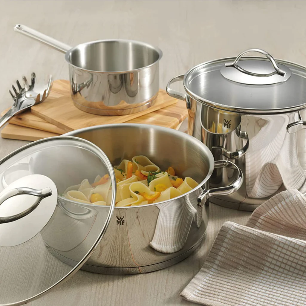 La batería 4 piezas de WMF contiene 3 ollas altas con tapa de cristal y un cazo, las piezas imprescindibles para equipar tu cocina: