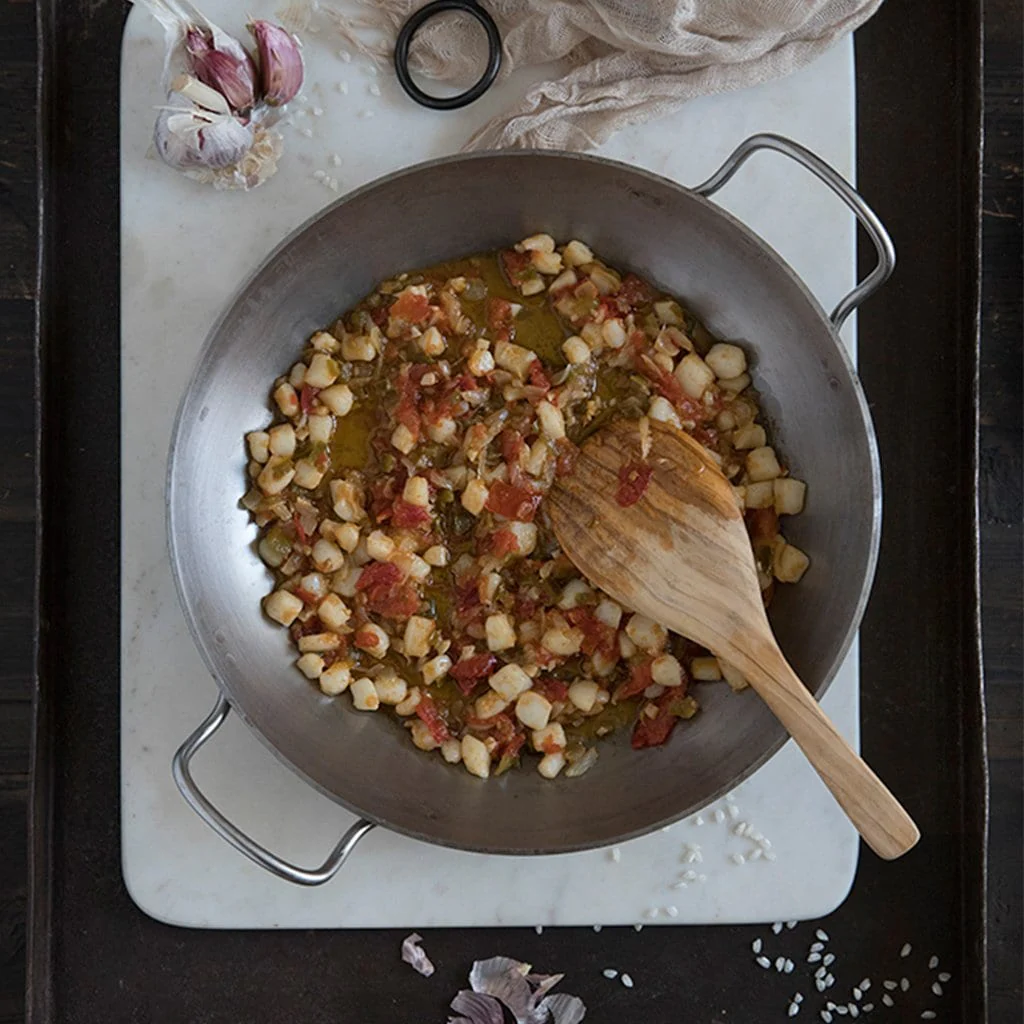 - El hierro de De Buyer distribuye tan bien el calor en toda la superficie que cualquier alimento queda estupendamente cocinado y doradito por igual, por lo que se evita encontrar algunos granos de arroz que queden crudos.