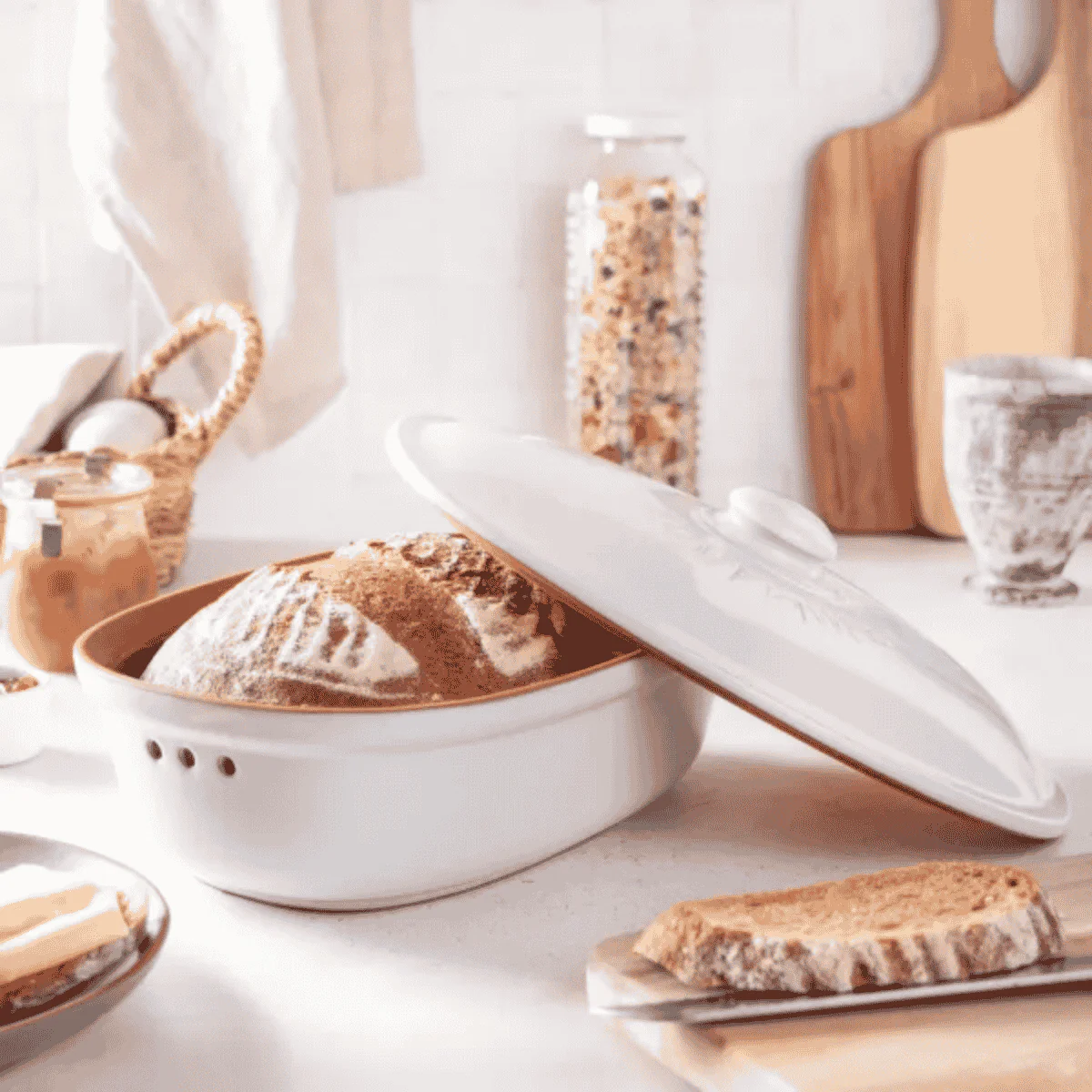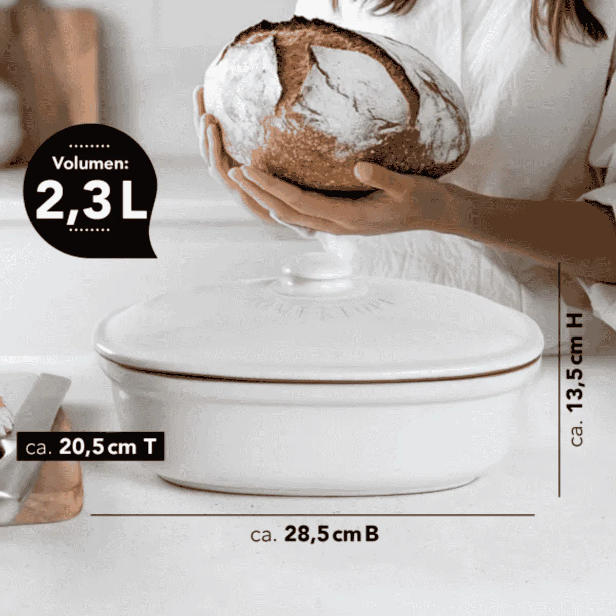 El pomo de la tapa es ideal para manejarla de forma cómoda y segura. Tanto en la encimera de la cocina, como en un estante de la despensa o en el centro de la mesa del comedor, esta preciosa panera de aire rústico se va a convertir en tu recipiente de conservación favorito para mantener el pan, los panecillos y tu bollería, ya sea la de tu panadería favorita o la que hagas en casa. Y también las verduras, hortalizas y frutas de temporada.