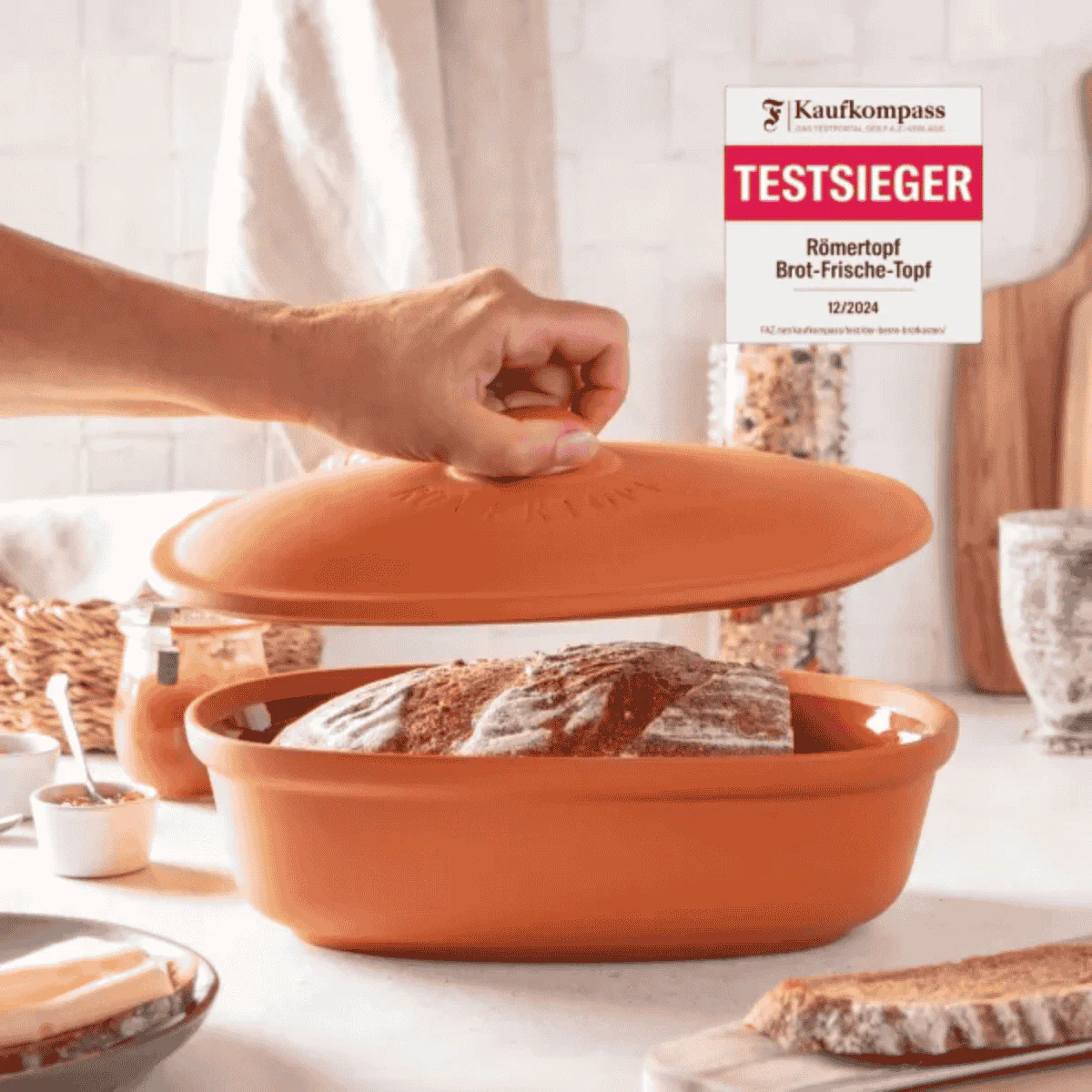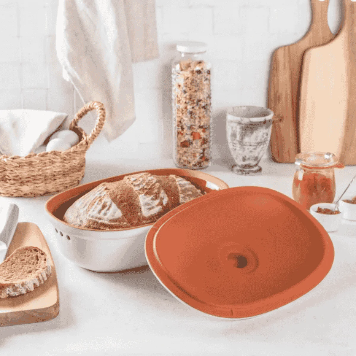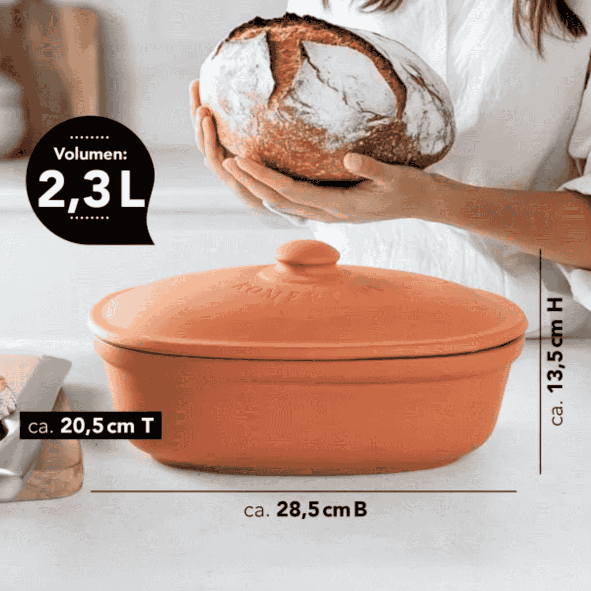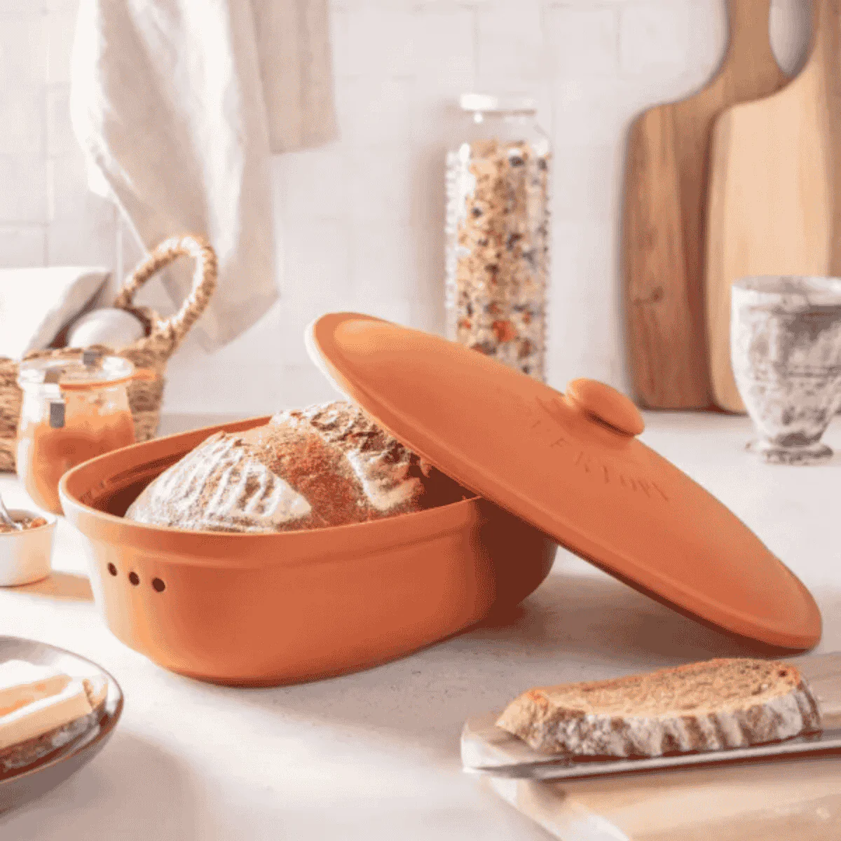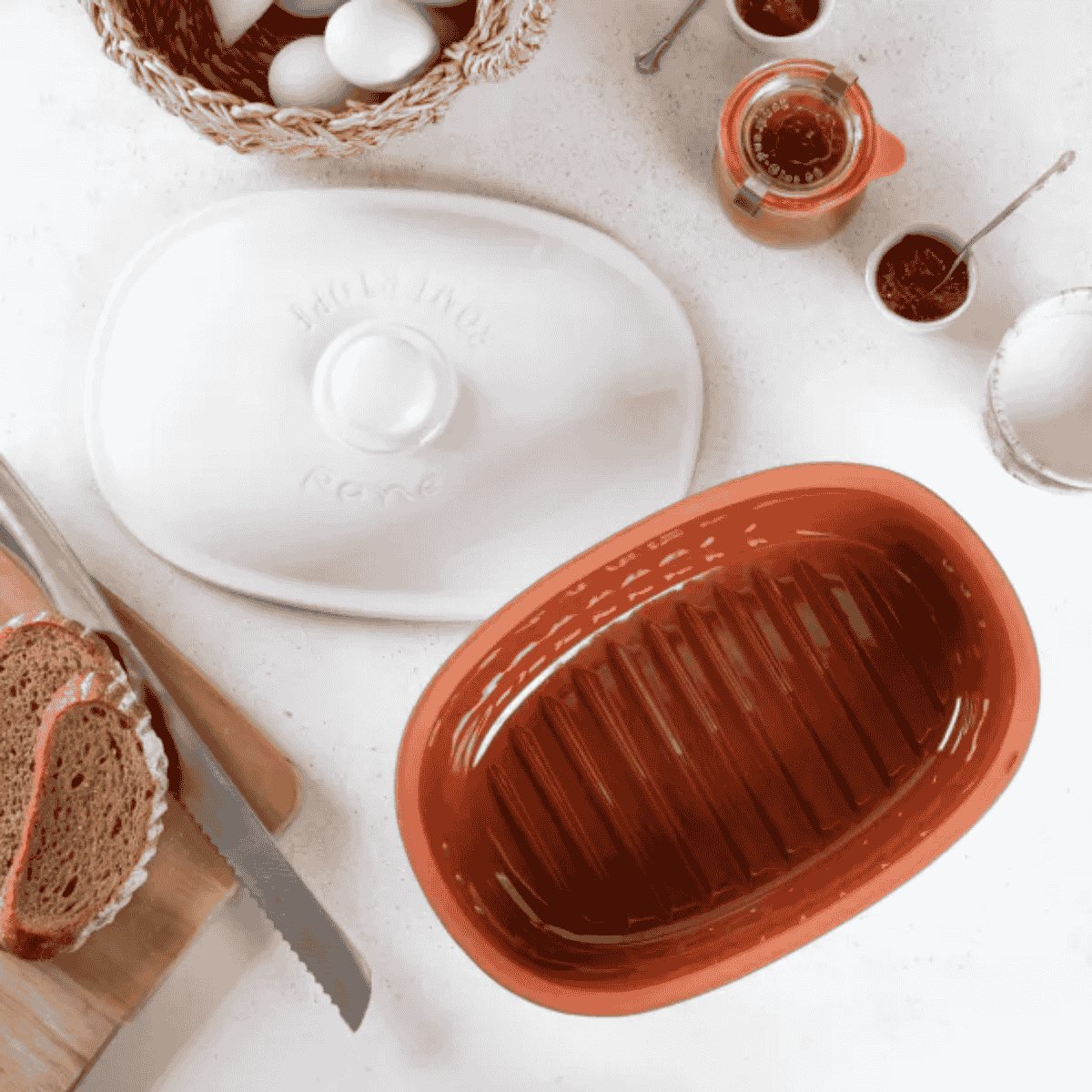 Fabricada con arcilla de alta calidad, la Panera ovalada de terracota Römertopf te ayudará a conservar el pan y la bollería frescos y en óptimas condiciones durante más tiempo. Robusta, elegante y muy resistente, esta panera con tapa se va a convertir en una aliada imprescindible en tu cocina gracias a su funcionalidad, su bonito diseño atemporal y a todas sus ventajas. Además, es perfecta como recipiente de conservación para hortalizas y frutas, desde cebollas, ajos o patatas, a naranjas, limones o mandarinas.