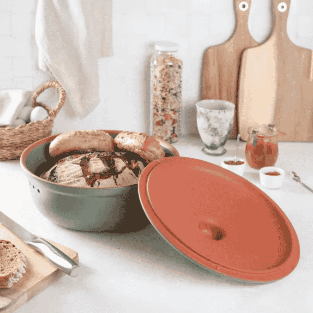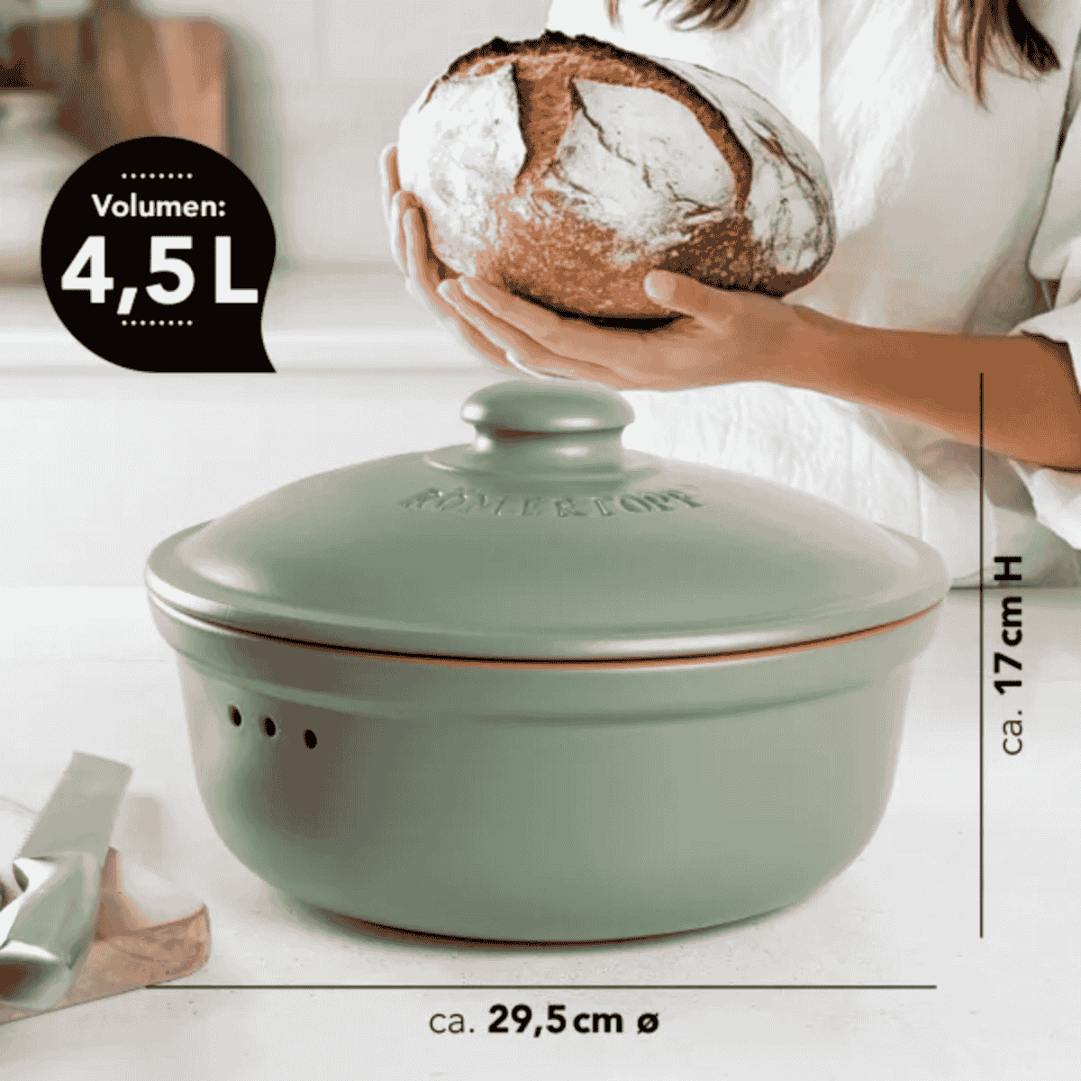 La panera está hecha con arcilla roja transpirable natural de excelente calidad, libre de plomo, cadmio, colorantes y plastificantes. La base dispone de estrías y está esmaltada por dentro, para que puedas dejar el pan, las frutas o las verduras con total tranquilidad. La tapa no está esmaltada y es semiporosa, por lo que garantiza una óptima regulación de la humedad. Ayuda a absorber el exceso de esa humedad y lo libera, gracias a los orificios de ventilación de la base, que garantizan la óptima circulación del aire. De esta forma prolonga la frescura y el sabor de los panes, bollería o alimentos que guardes, previniendo la aparición temprana del moho y evitando el desperdicio alimentario.