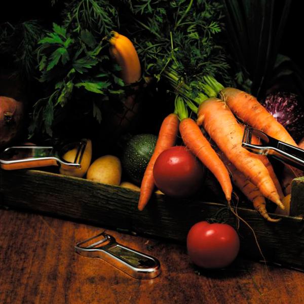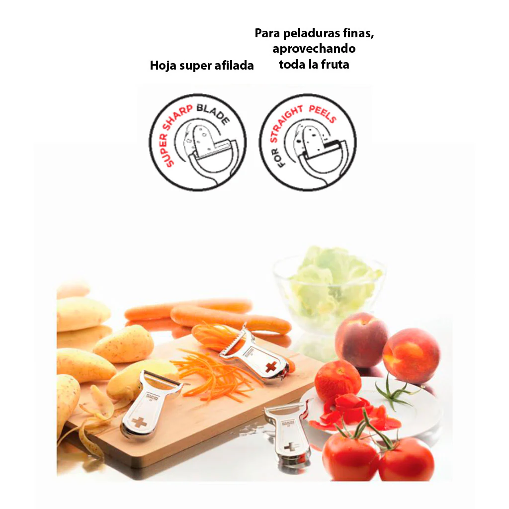 - El pelador de cuchilla lisa, perfecto para pelar frutas duras y vegetales como patatas, zanahorias, calabacines, boniatos o pepinos. Ofrece un corte muy fino para un total aprovechamiento de las piezas a pelar.