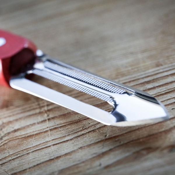 - Su mango de madera de haya en color rojo hace un pelador muy bonito y cómodo de usar.