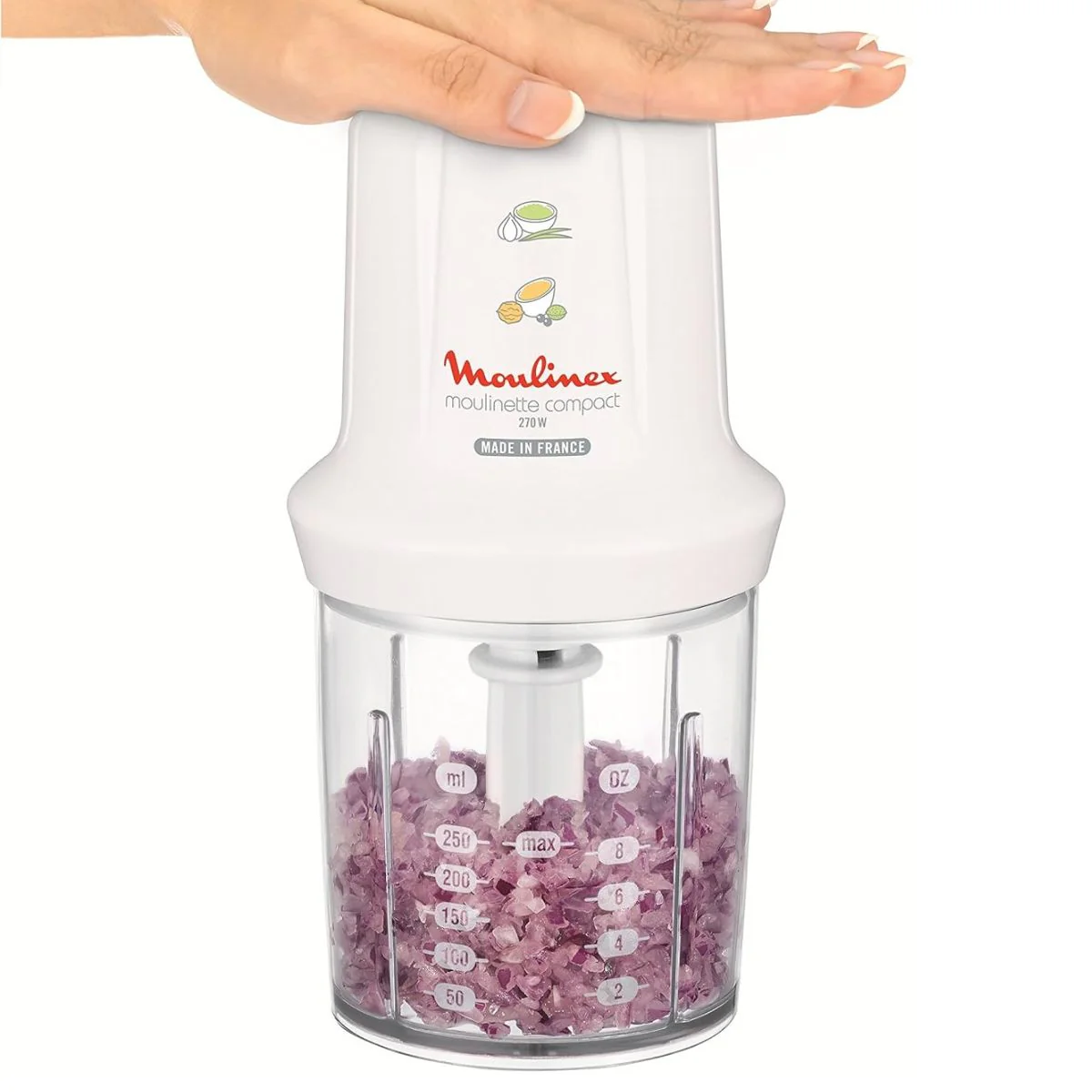 La picadora de mano Compact Moulinex es mucho más que una simple picadora, es un 3 en 1 pequeña y eficaz, que corta, pica y tritura. Es una oportunidad excelente para ahorrar espacio en la cocina porque con un mismo utensilio puedes conseguir cubrir 3 necesidades diferentes. Además, sus cuchillas de acero inoxidable son de lo más resistentes, con lo que no hay ajo, frutos secos, fruta o verdura que se resista a la picadora de mano Compact de Moulinex.