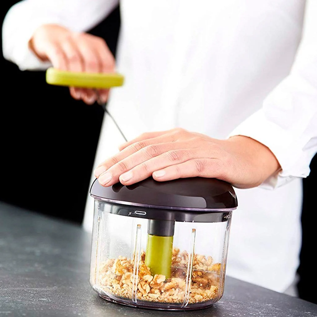 Su sistema de tiro permite que las cuchillas de acero giren en el recipiente y troceen los ingredientes que has añadido. Además, podrás escoger el punto exacto de corte o picado que necesites, al tirar más o menos veces del asa. ¡Así de simple!