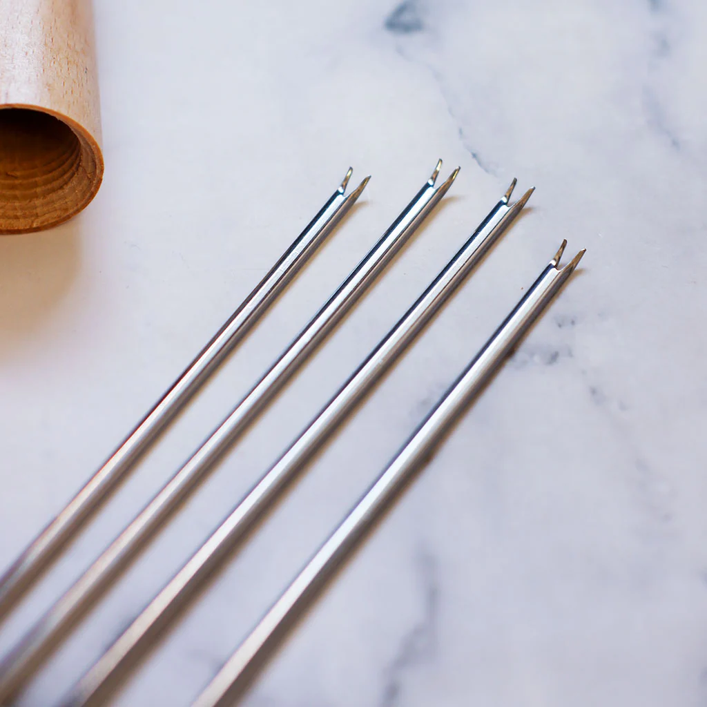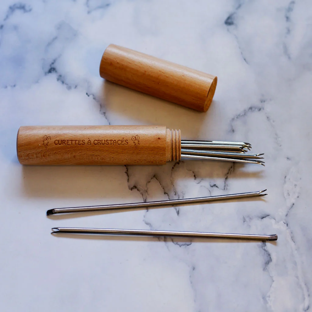 Los Pinchos inox para crustáceos Roger Orfevre son perfectos para el marisco. Fabricados en acero inoxidable, se presentan en un set de doce pinchos dentro de un bonito estuche cilíndrico de madera de haya. Están especialmente diseñados para llegar a todos los rincones de los mariscos, ya que son largos y tienen una doble punta en su extremo.