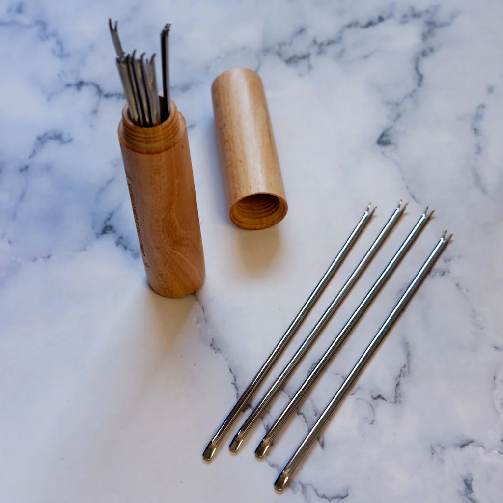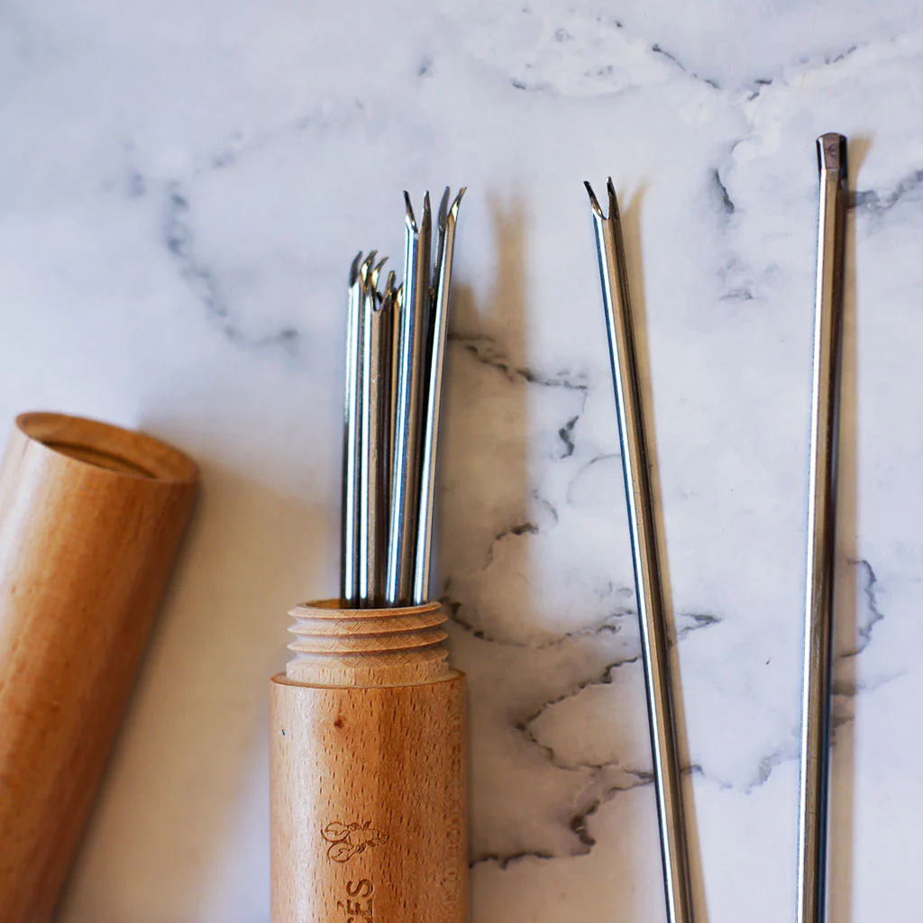 Están fabricados en Francia y la caja de tubo cuenta con cierre de rosca, por lo que es perfecta para guardarlos y tenerlos siempre a punto para cualquier ocasión. Con solo desenroscar la tapa, quedarán a la vista los 12 pinchos. El estuche de madera de haya mide 23,5 cm de largo x 3,5 cm de diámetro y cuentan con un grabado a láser identificativo.