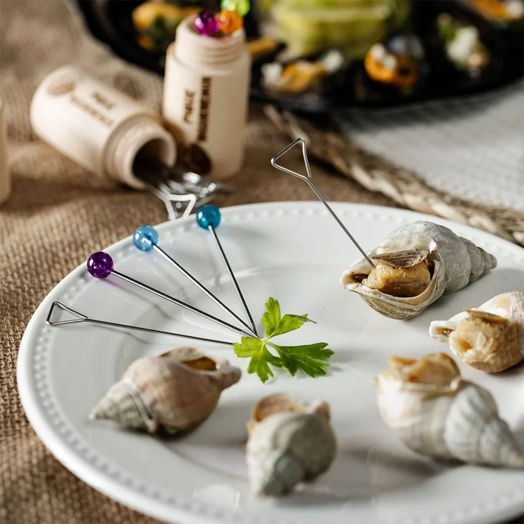 - Pinchos de colores: el set incluye 6 pinchos de acero inoxidable con cabeza de bola de colores. Son perfectos para pinchar todo tipo de aperitivos que hayas presentado en la mesa y también para la fruta troceada. El tubo de madera de haya en el que se presentan mide 9,5 cm de largo x 3,5 cm de diámetro.