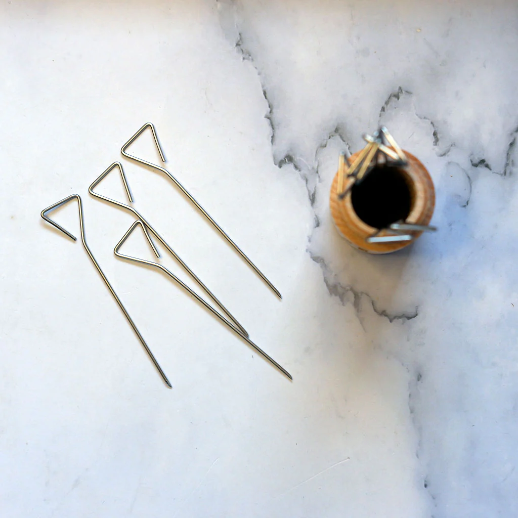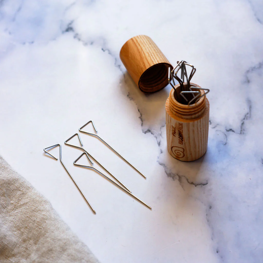 - Pinchos inox: el set incluye 12 pinchos de acero inoxidables con cabeza en triángulo. Son ideales para pinchar los bígaros, las aceitunas, la chistorra troceada o la fruta cortada a dados. ¡Perfectos para el aperitivo! El tubo de madera de haya en el que se presentan mide 9,5 cm de largo x 3,5 cm de diámetro.