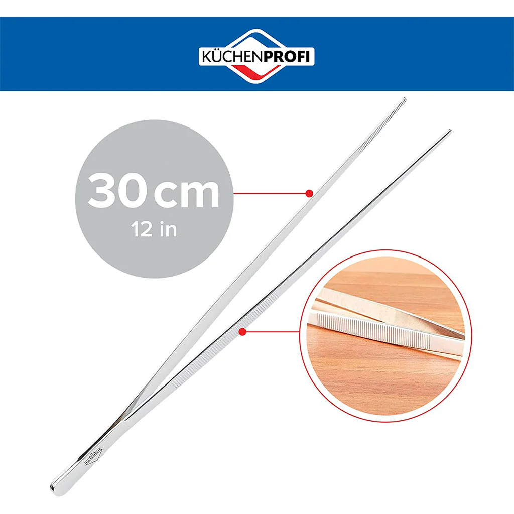 La Pinza de acero inoxidable de Küchenprofi es el ayudante perfecto en tu cocina. Fabricada con materiales de alta calidad, esta pinza profesional de acero inoxidable es tan duradera como práctica y versátil. Con sus 30 cm de longitud es ideal para voltear la carne o las verduras en la parrilla, la sartén o el horno, y para emplatar con precisión delicados aperitivos y postres.