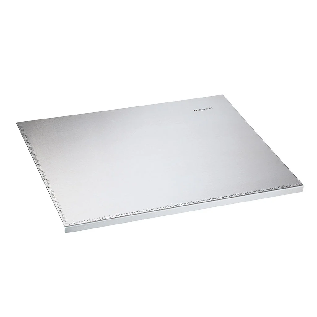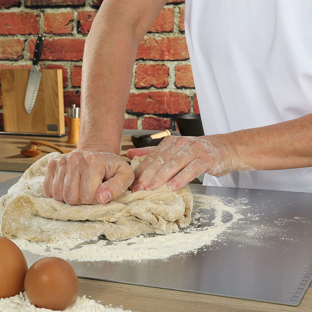 Plancha lisa con borde que actúa como tope, para colocar sobre la encimera y trabajar de forma segura, sin que la plancha se mueva.