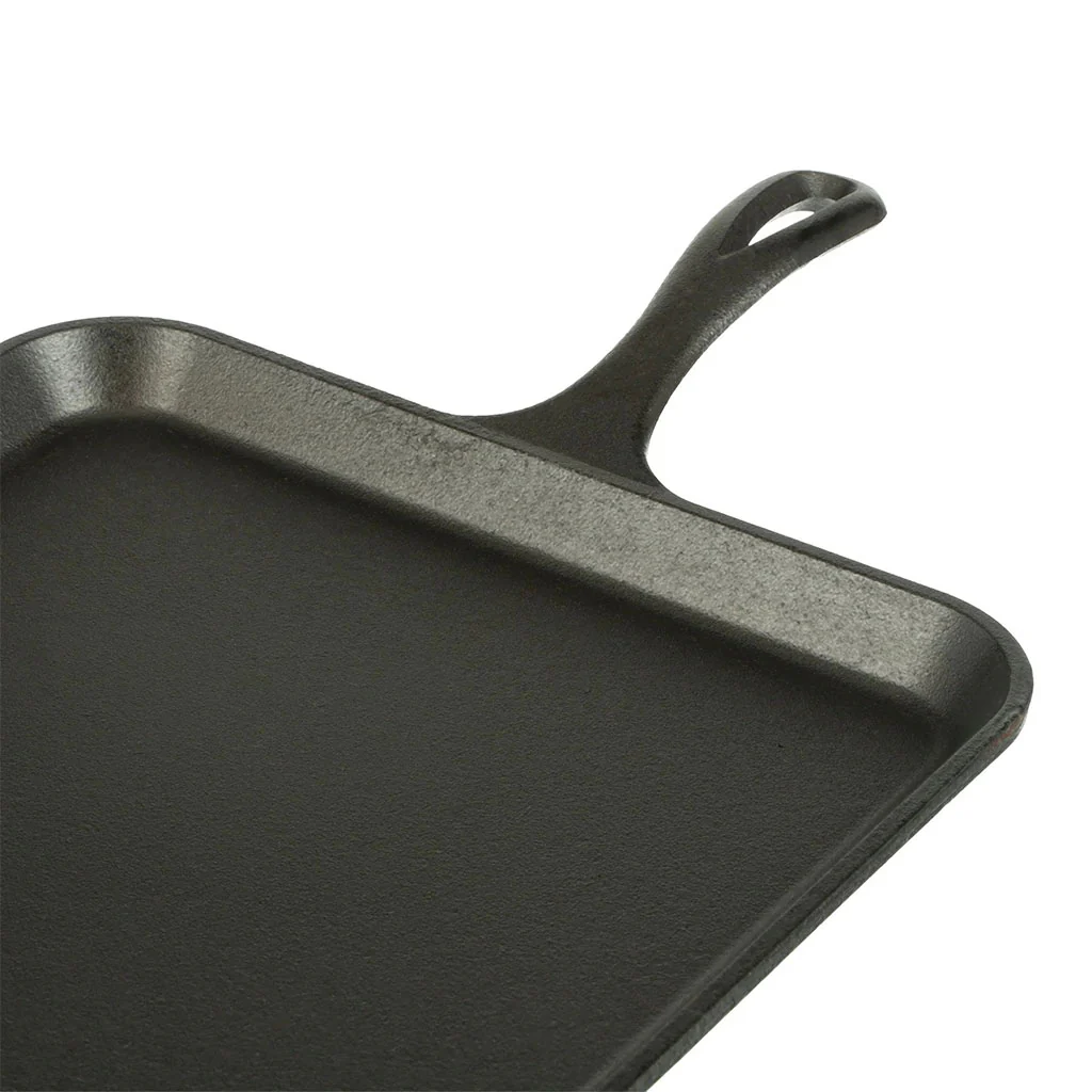 - Plancha cuadrada lisa de hierro fundido con mango.