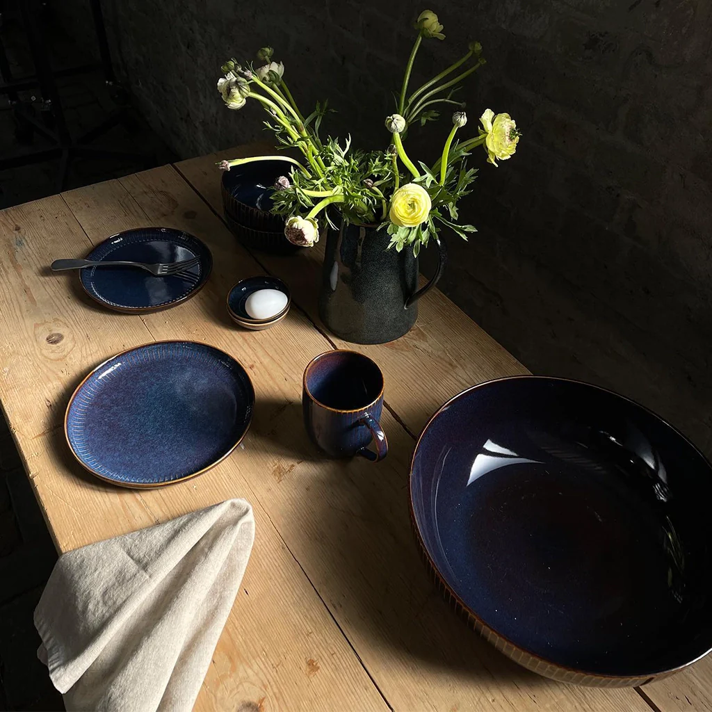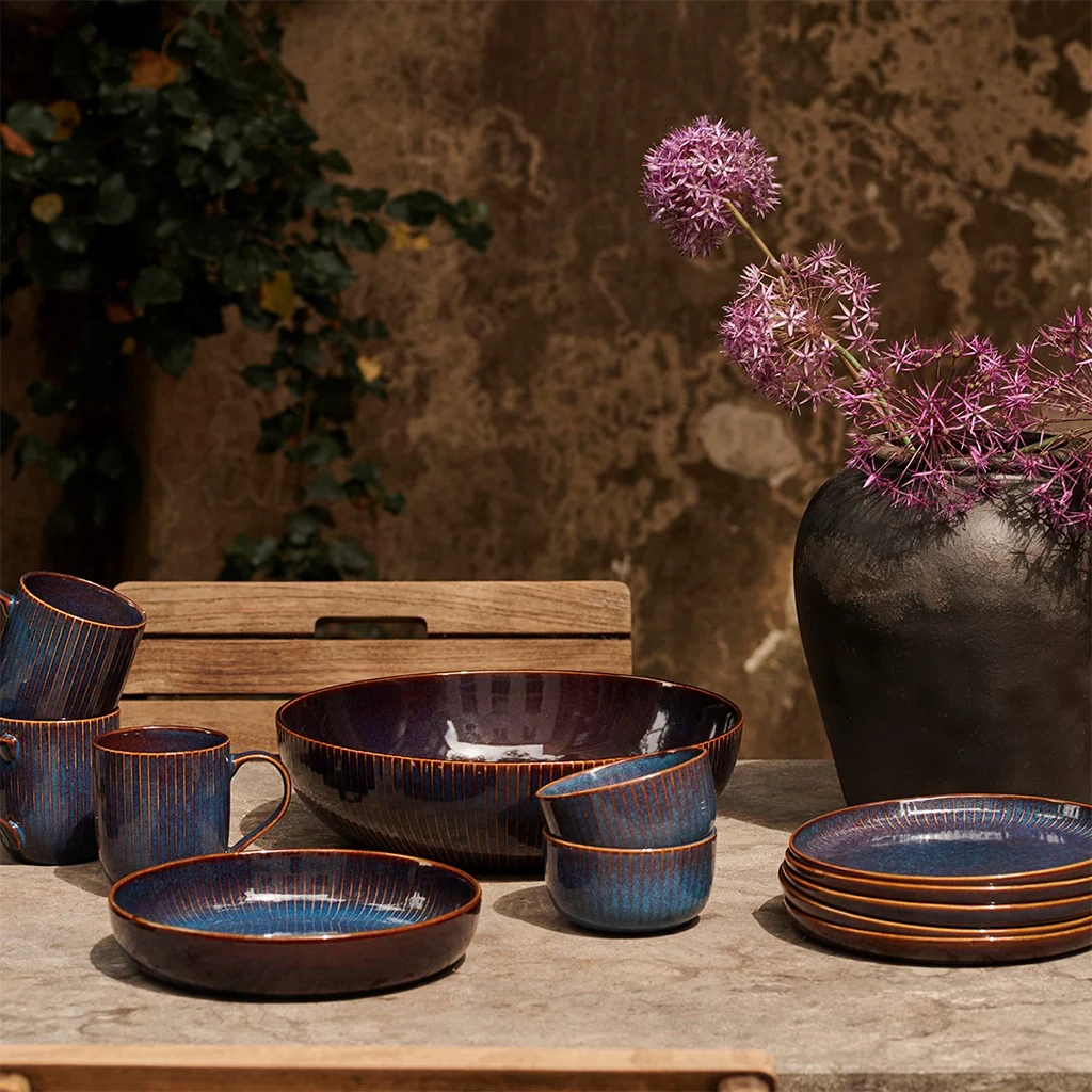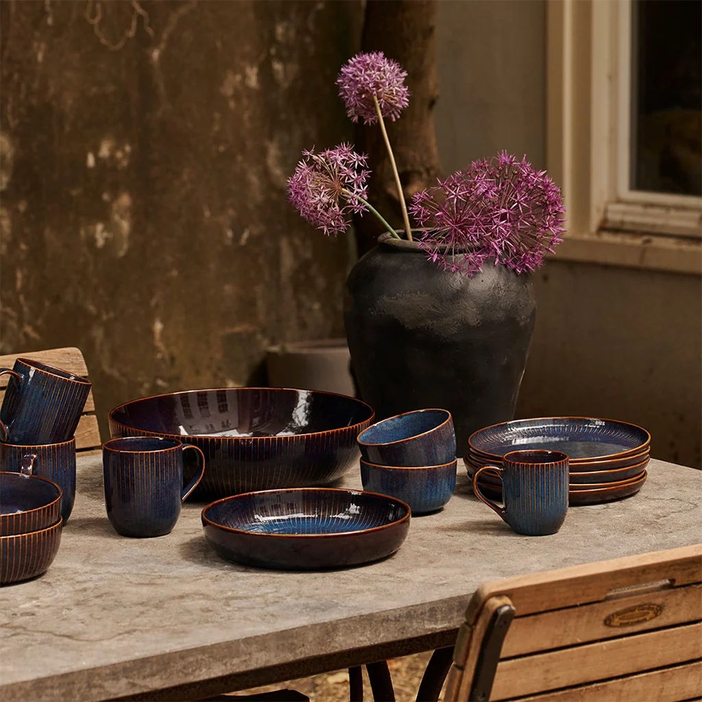 Los platos se presentan en dos colores, azul y gris, combinando en el diseño de su interior y exterior los esmaltados lisos con sutiles trazos de rayas que evocan las forma de conchas y flores.