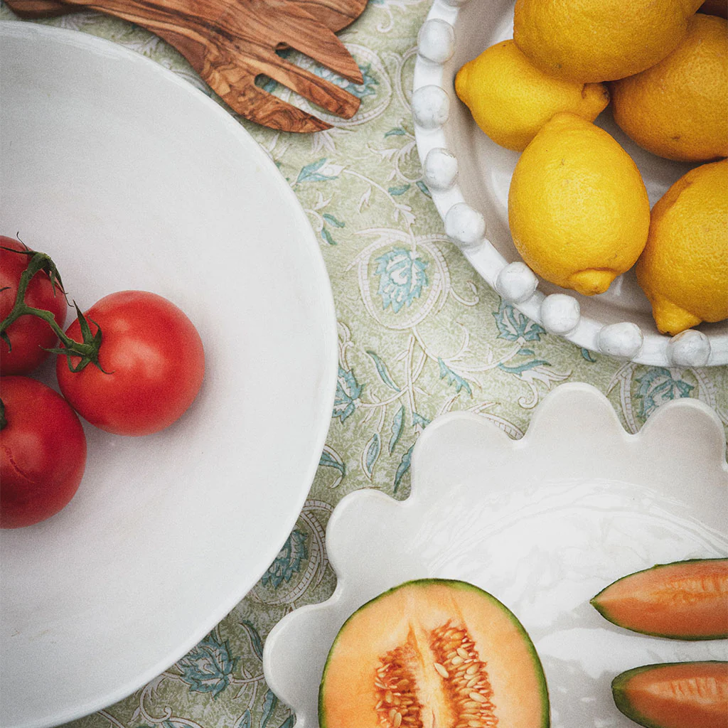 Plato llano de 27 cm. Con el detalle de su borde en altura ligeramente irregular, es perfecto para los segundos platos, especialmente para piezas enteras o de mayor tamaño, ya sean entrecots o pescados enteros como la dorada de ración o el lenguado. Es también una pieza preciosa a modo de bandeja para presentar unos aperitivos, canapés o un surtido de quesos para el postre. Es también un bajoplato ideal.